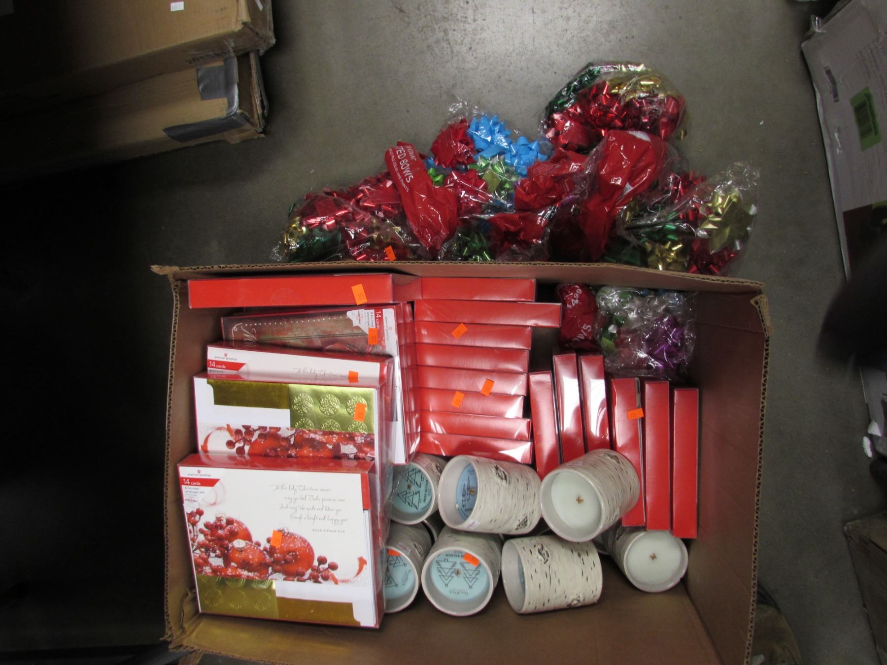 BOX OF ASSORTED CANDLES, XMAS CARDS, BOWS