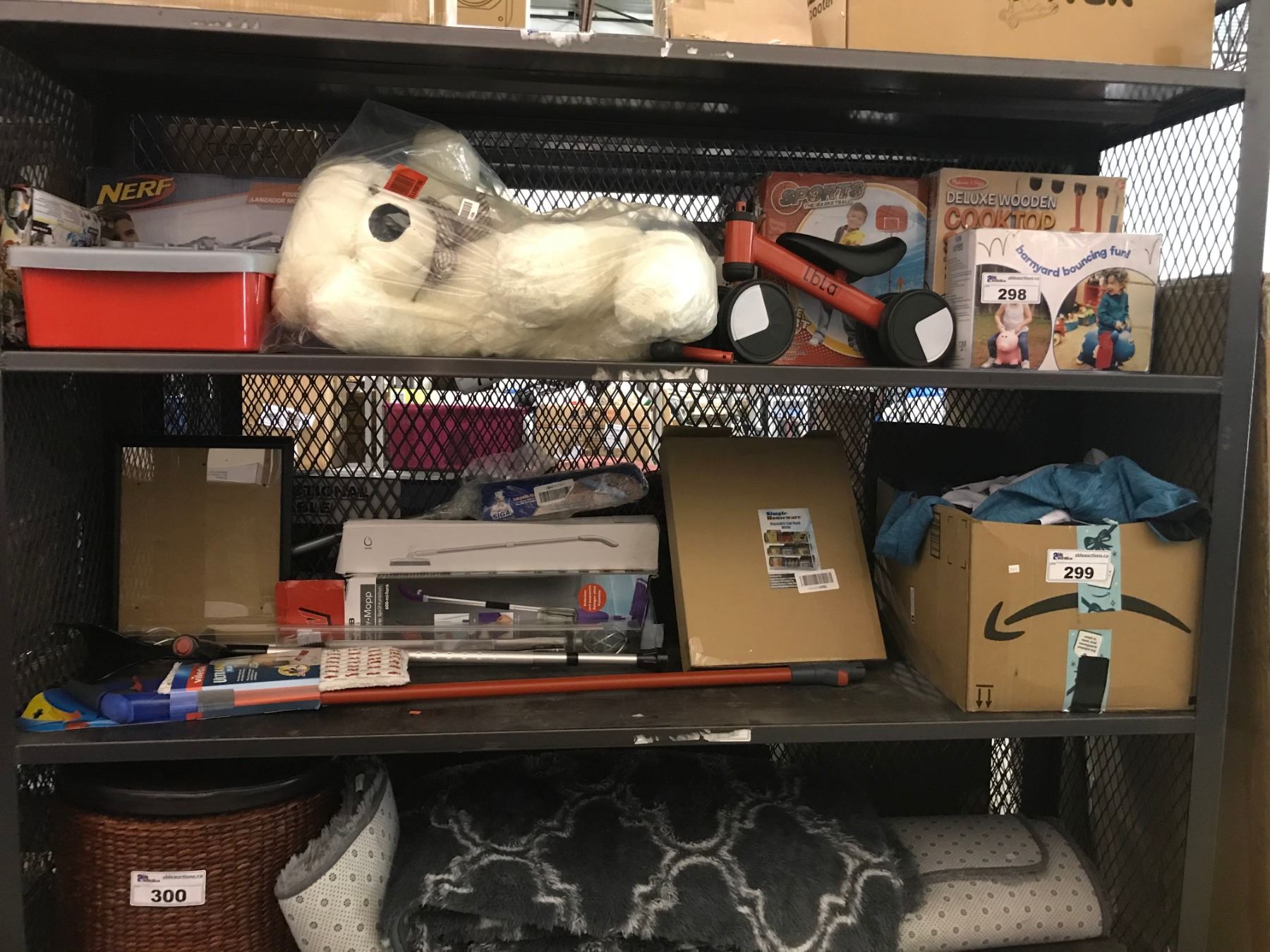 BOX OF ASSORTED CLOTHES, STACKABLE CAN RACK, VILEDA MOP, SWIFFERS, CURTAIN ROD, ETC