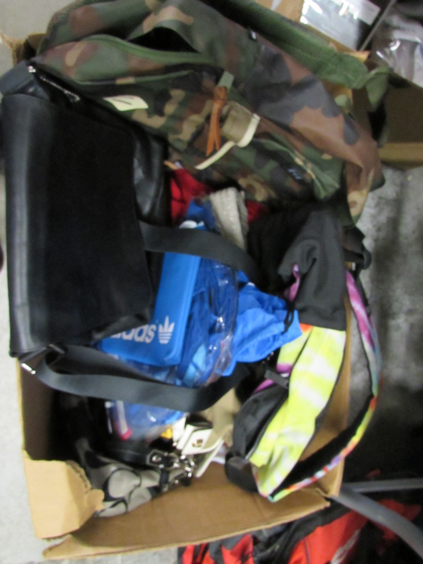 BOX OF ASSORTED CLOTHING (GUESS PURSE, HERSCHEL BAG, COACH PURSE, COSTUMES, SHORTS, NEFF BACK PACK, ADIDAS BAG)
