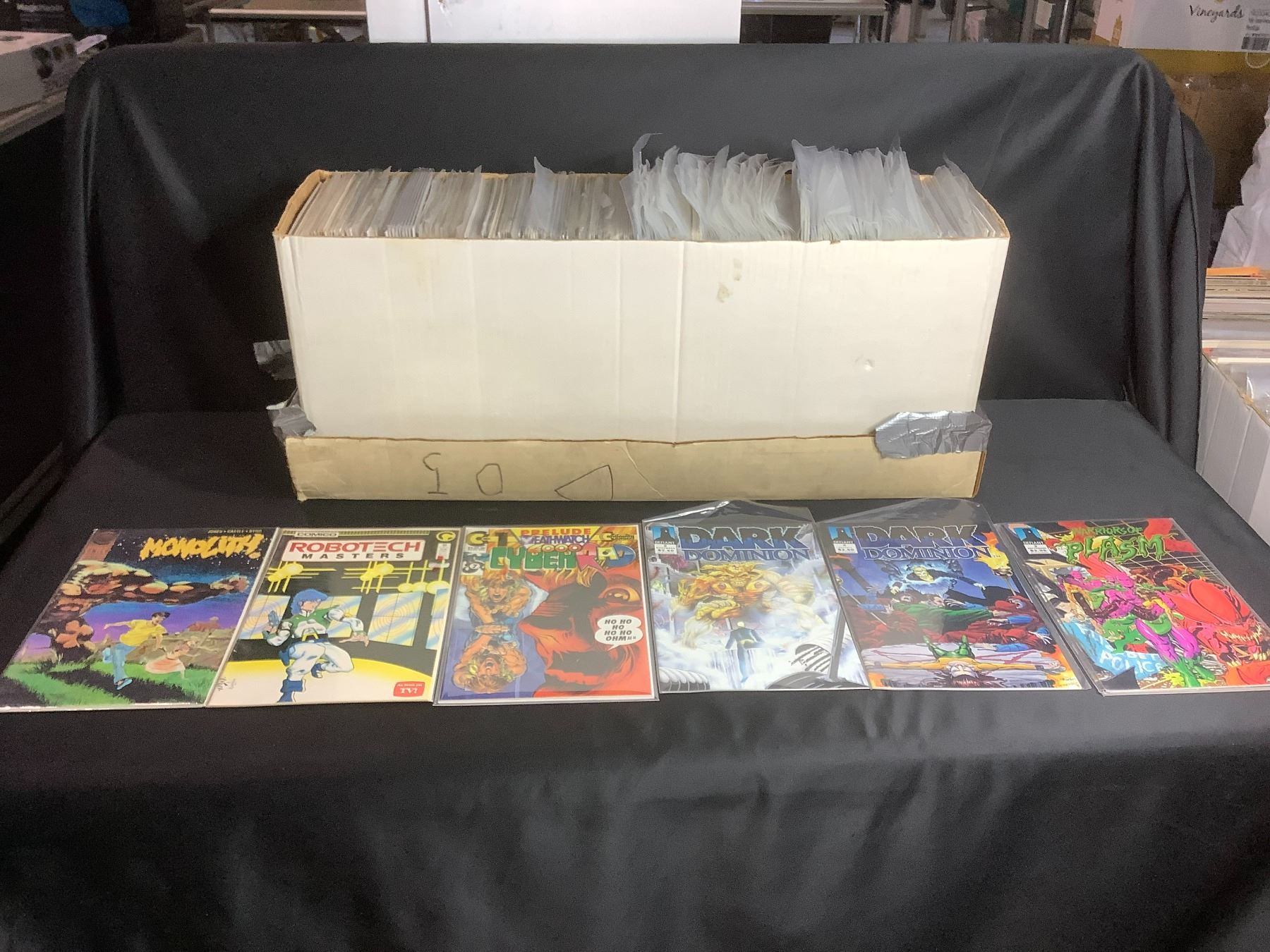 BOX OF ASSORTED COMIC BOOKS TITLES INCLUDE : DEATHWATCH, STARBLAZERS, AMERICAN VIRGIN, BITE CLUB, GANGLAND, & MUCH MORE