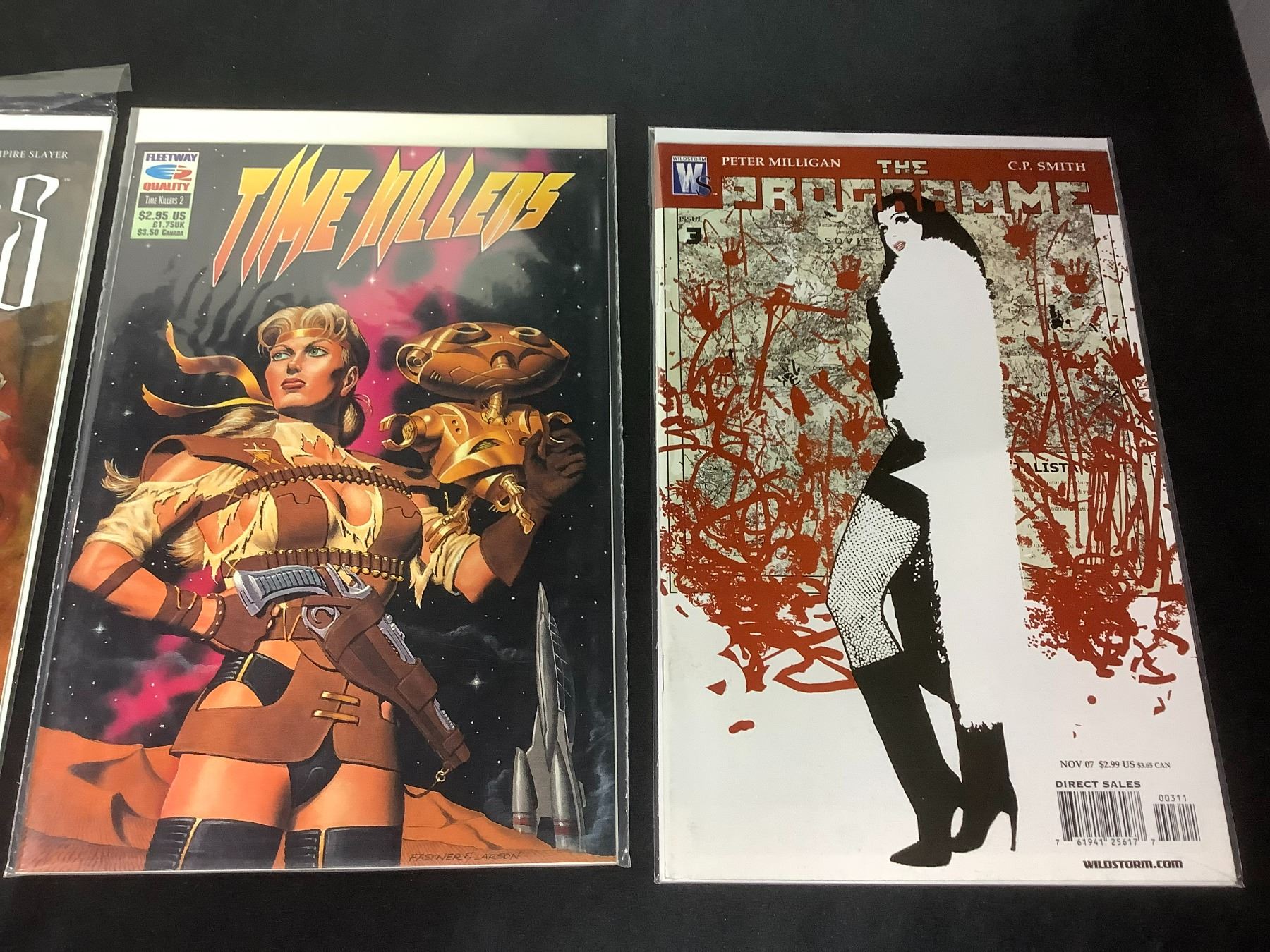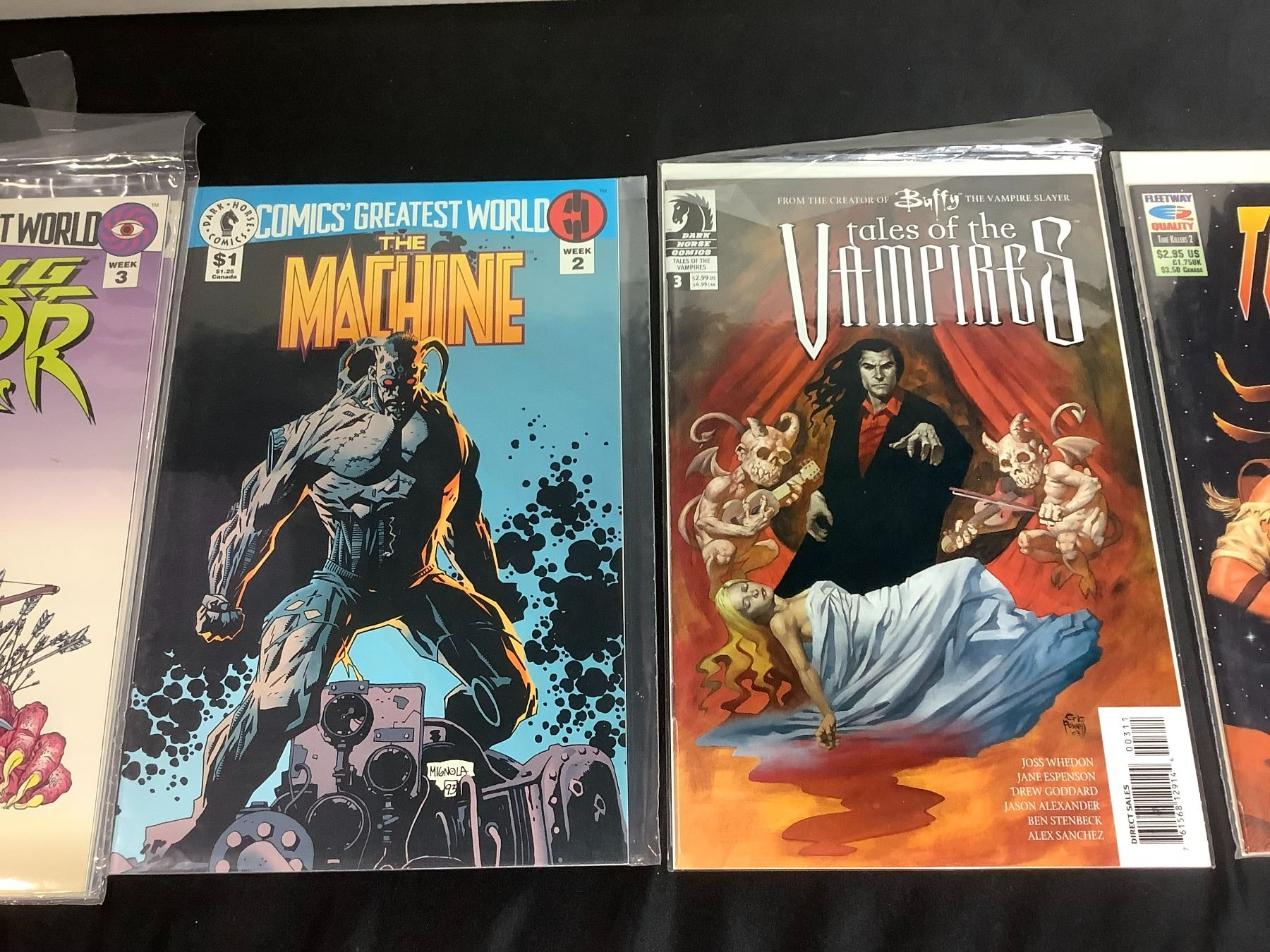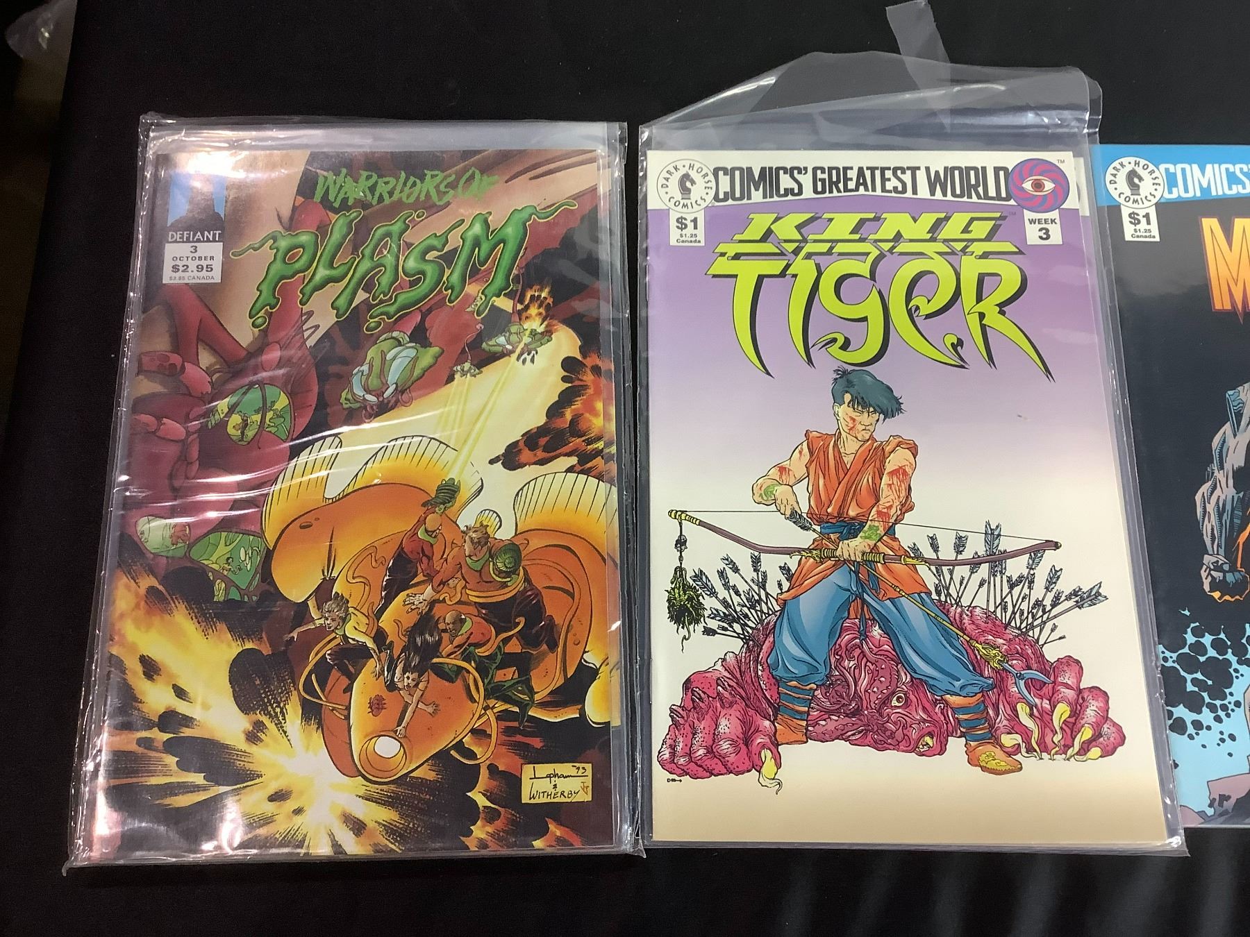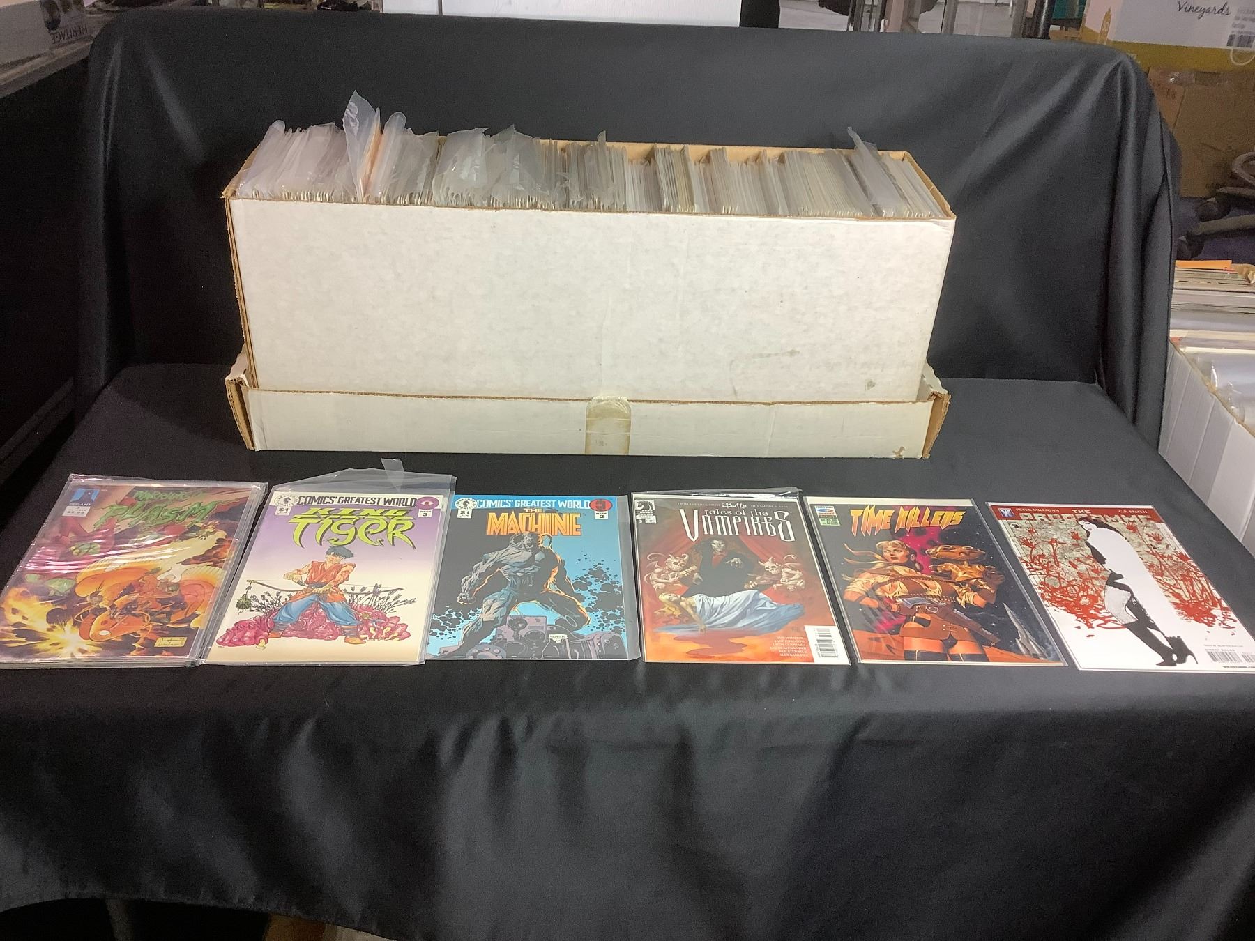 BOX OF ASSORTED COMIC BOOKS TITLES INCLUDE : JUDGE DREDD, BLADE, THE YOUNG INDIANA JONES CHRONICLES, ROBOCOP, TARZAN, & MUCH MORE