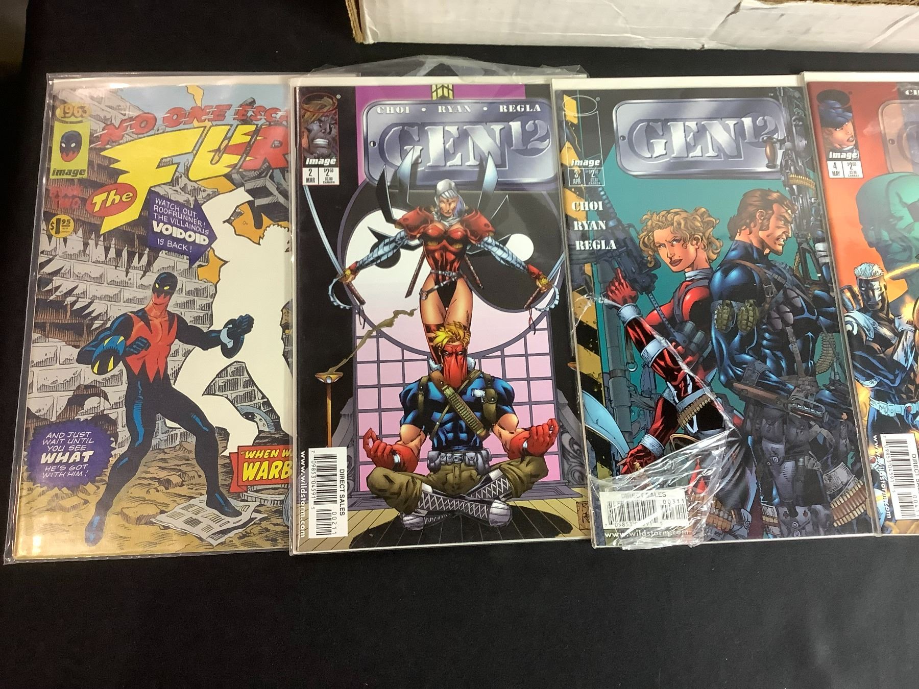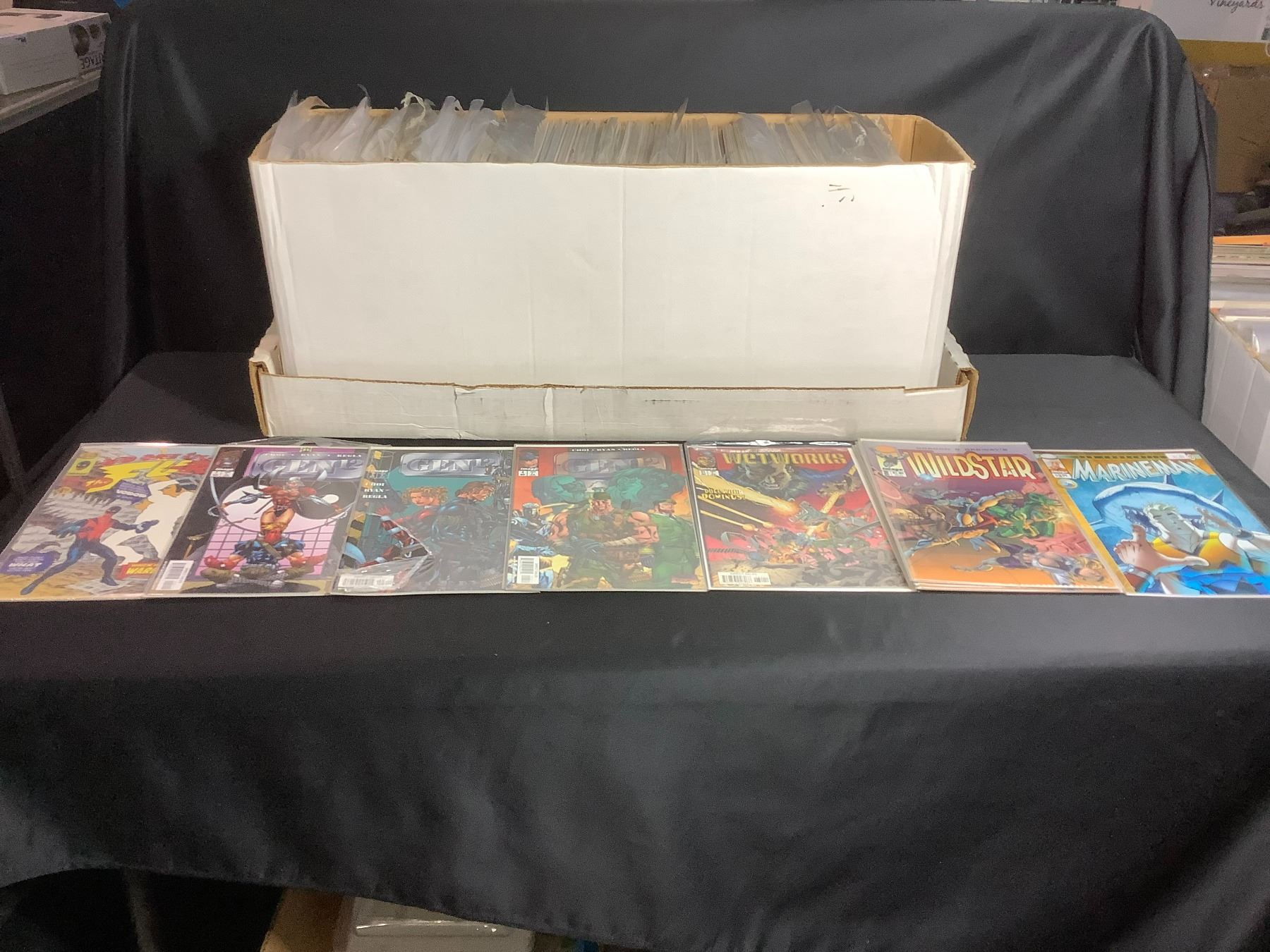 BOX OF ASSORTED COMIC BOOKS TITLES INCLUDE : WILDCATS, FURY, GHOST SPY, IRON GHOST, & MUCH MORE