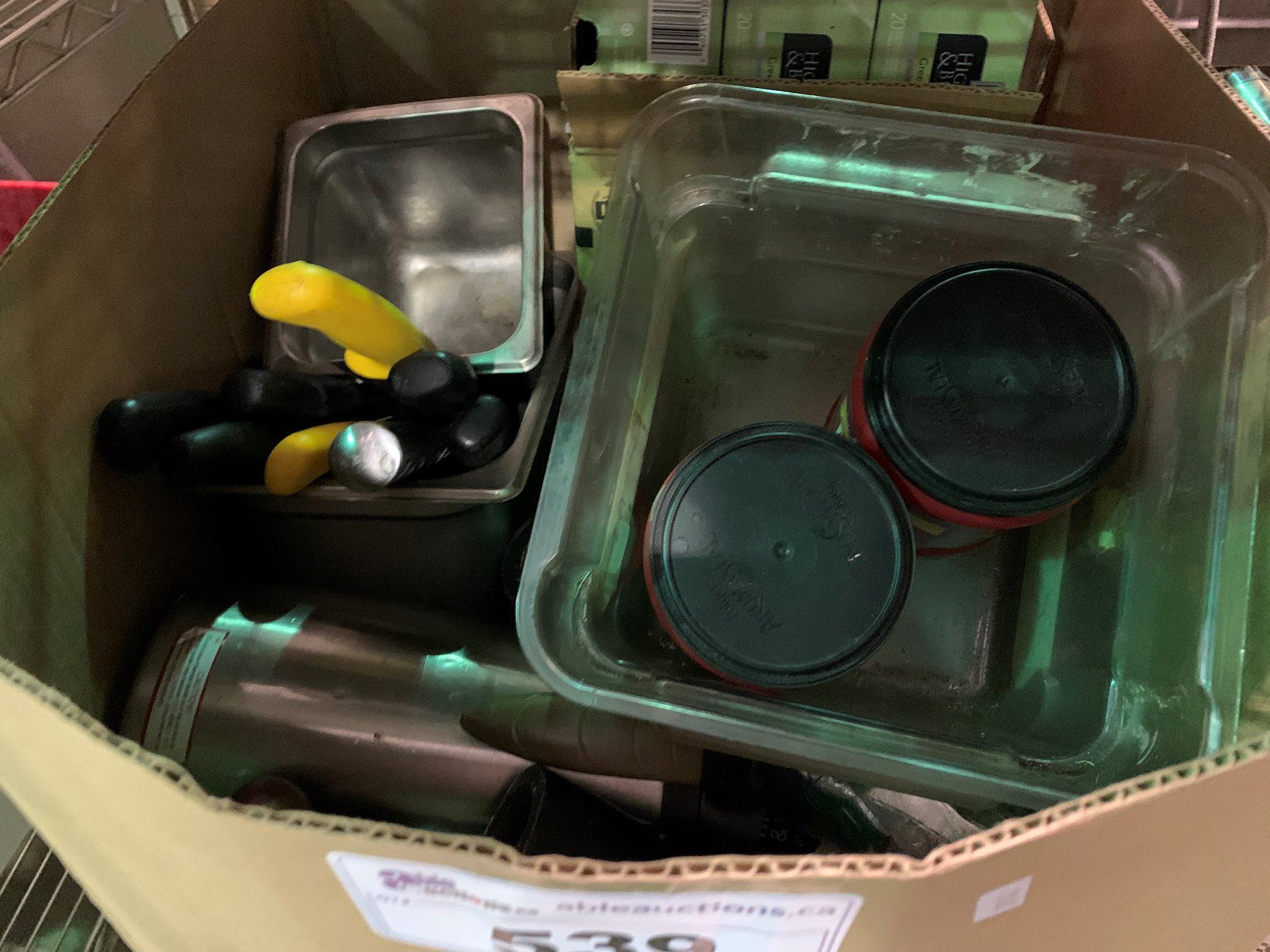 BOX OF ASSORTED CONDIMENT TRAYS & CHEF KNIVES