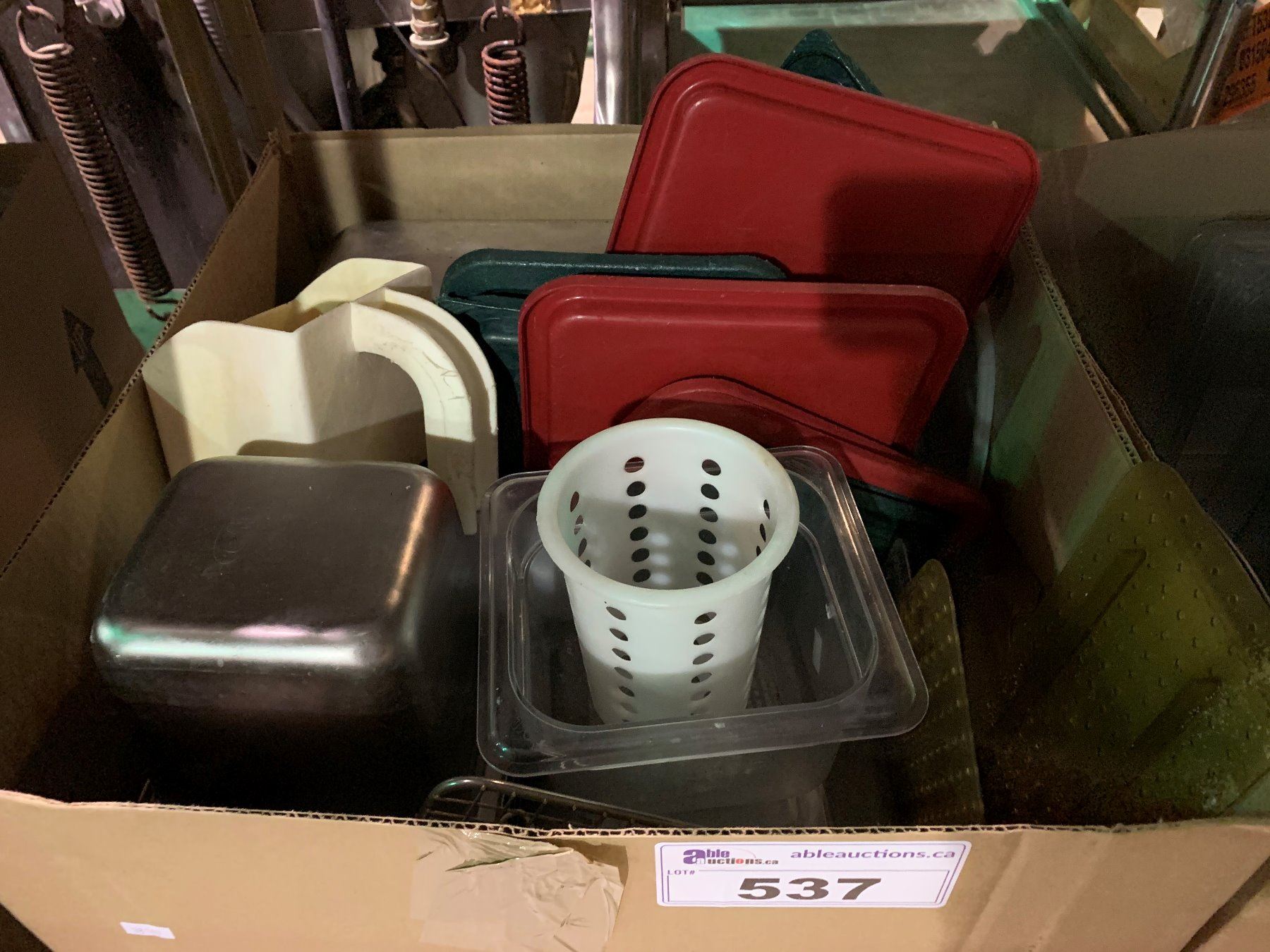 BOX OF ASSORTED COOLING RACKS & CONDIMENT TRAYS WITH LIDS