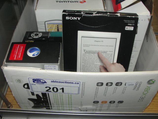 BOX OF ASSORTED ELECTRONICS; SONY DIGITAL READERS, XPERIA SMART PHONE, FUJIFILM DIGITAL CAMERA, TOM