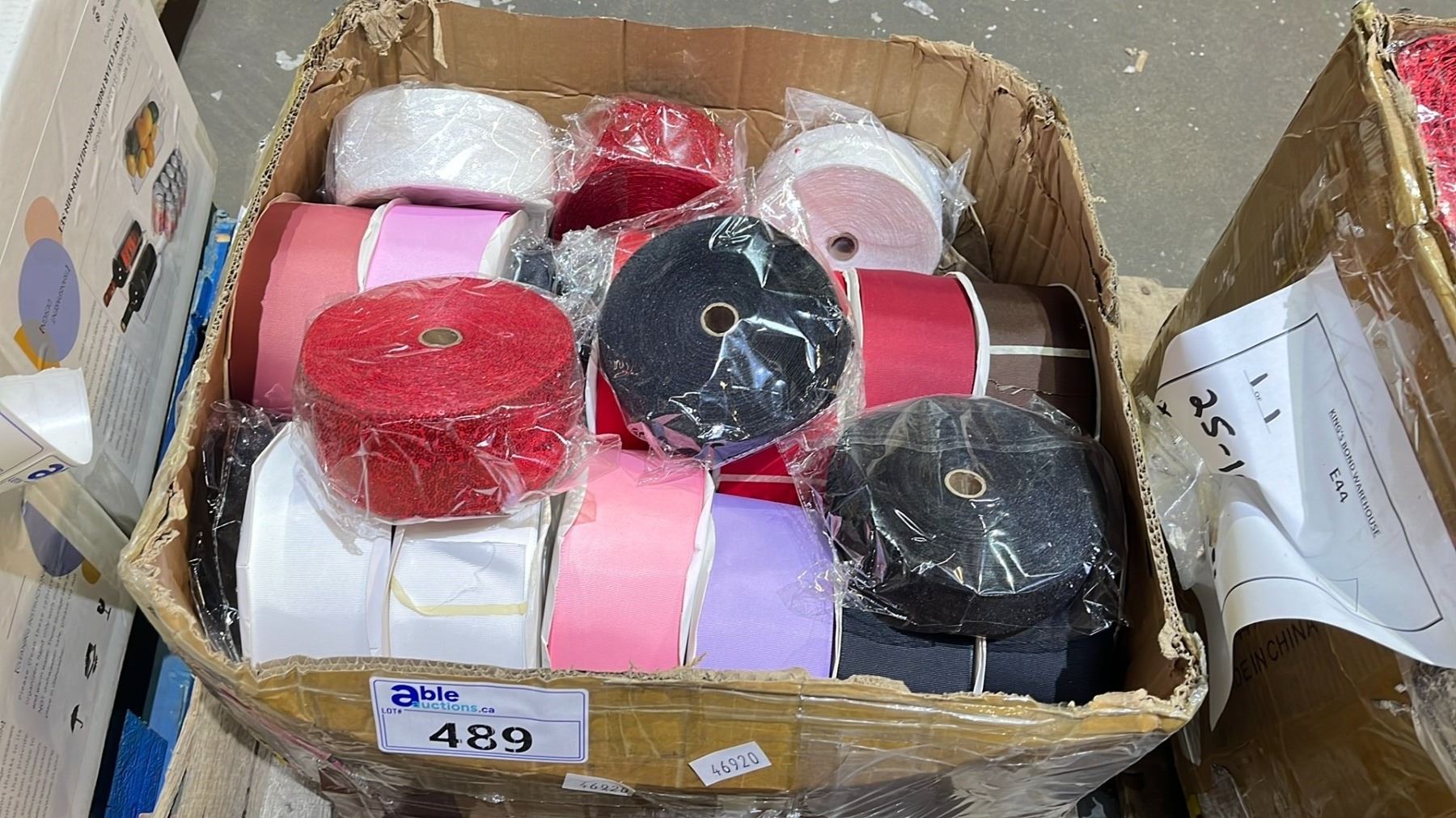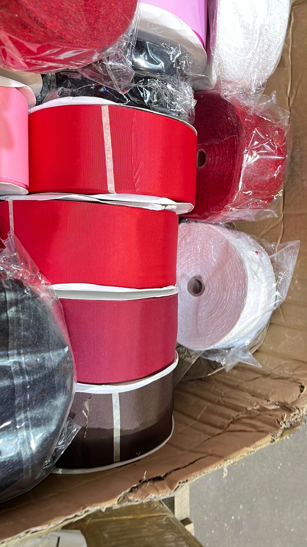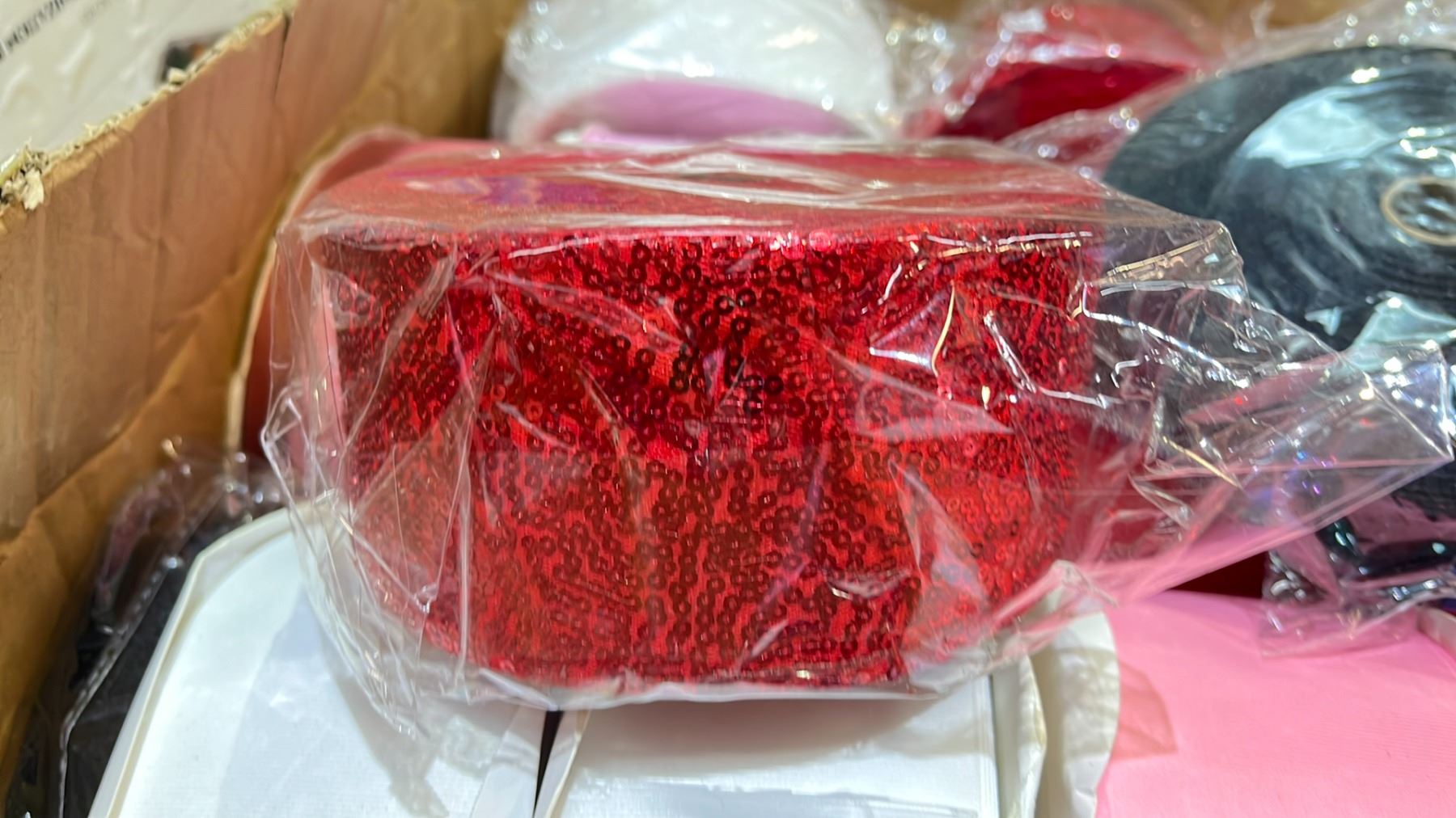BOX OF ASSORTED FABRIC & SEQUIN ROLLS
