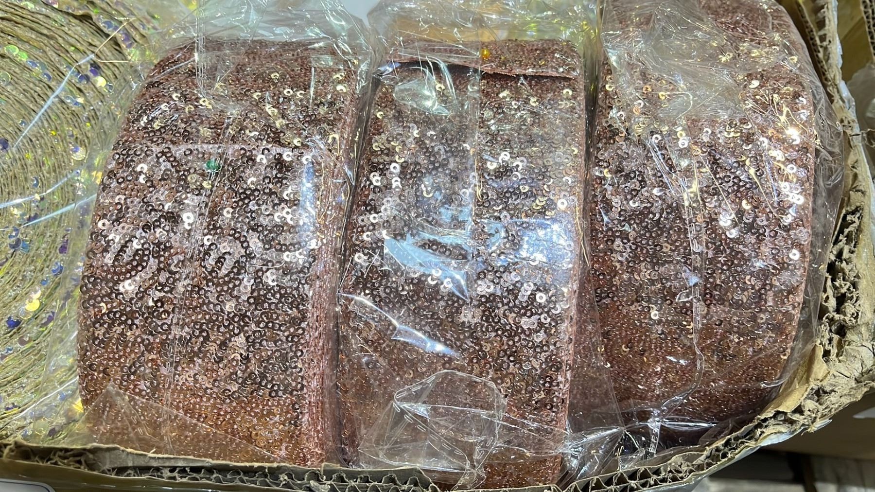 BOX OF ASSORTED FABRIC & SEQUIN ROLLS