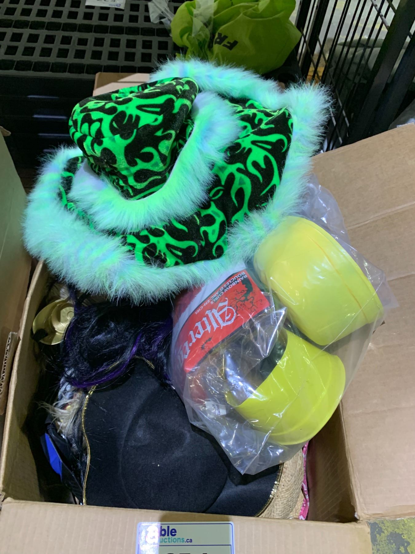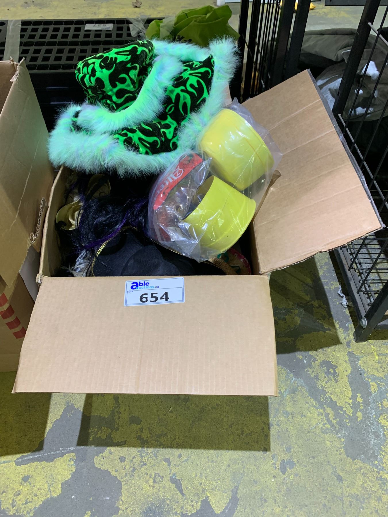 BOX OF ASSORTED HATS, WIGS AND MORE