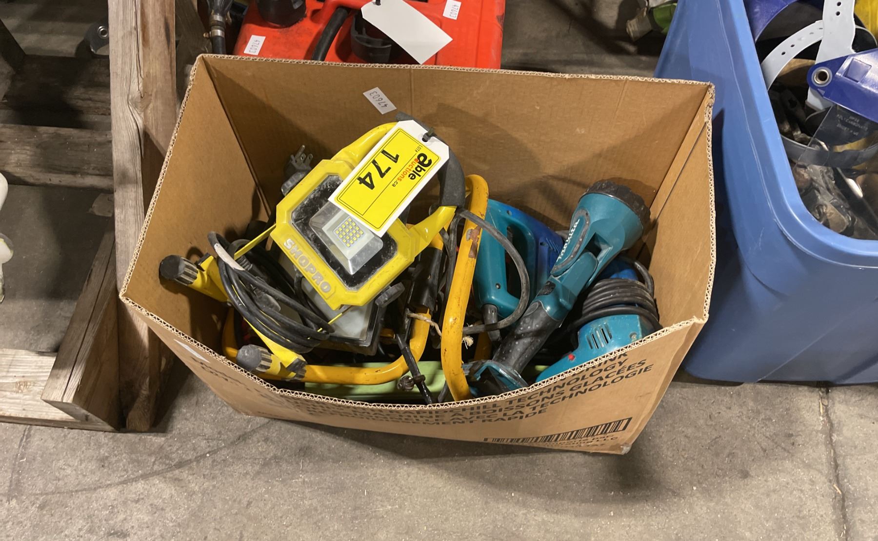 BOX OF ASSORTED INDUSTRIAL WORK LIGHTS & POWER TOOLS