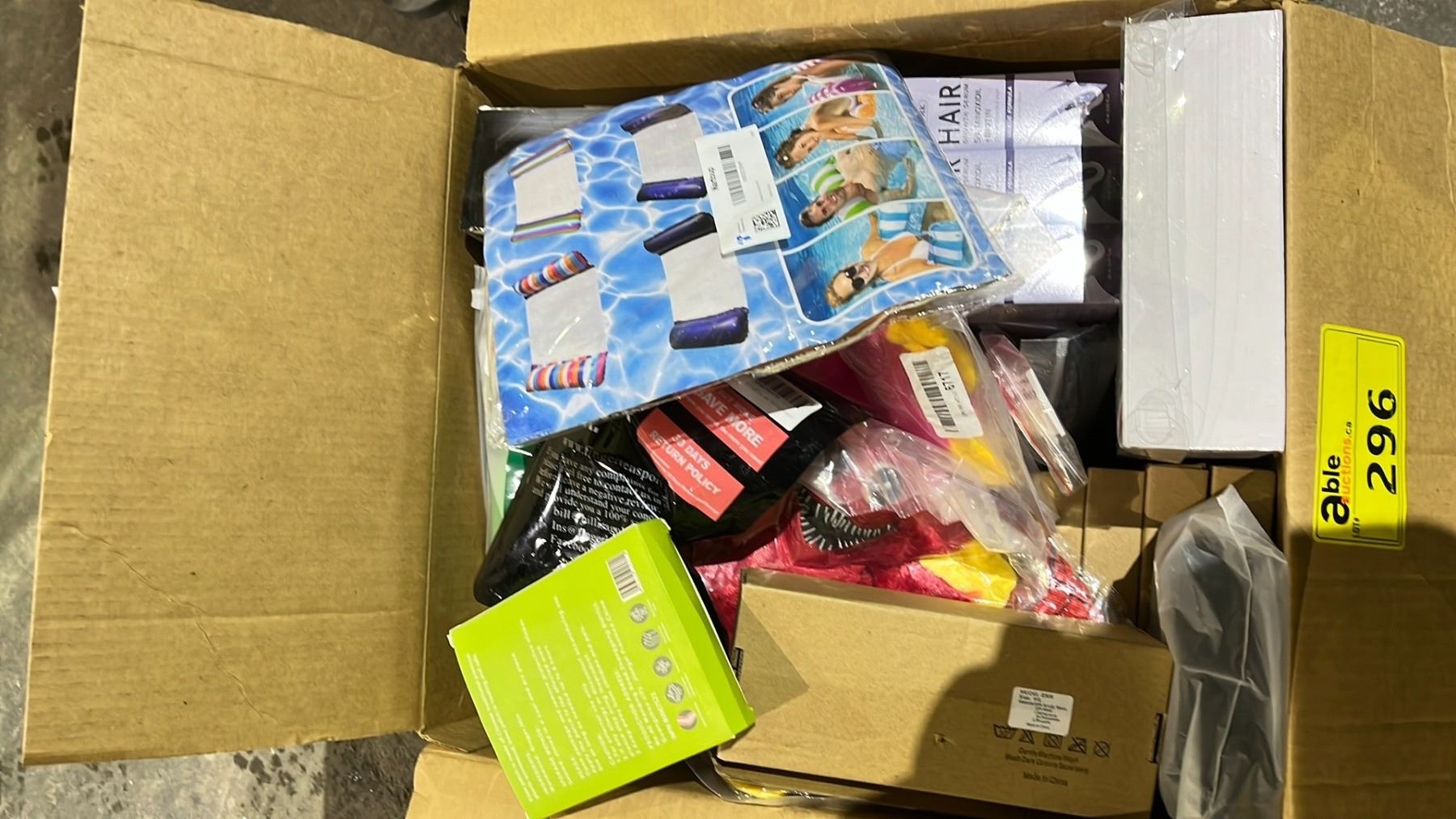 BOX OF ASSORTED ITEMS INCLUDING; TIGER TOES PET SOCKS, WELLKNEE KNEE PATCH, POOL FLOATS AND MORE