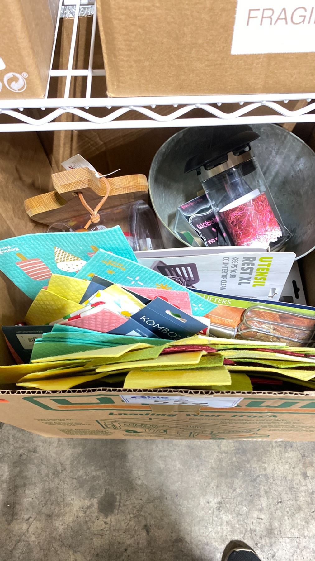 BOX OF ASSORTED KITCHENWARE; POT HOLDERS, SPONGES, CUTTING BOARDS AND MORE