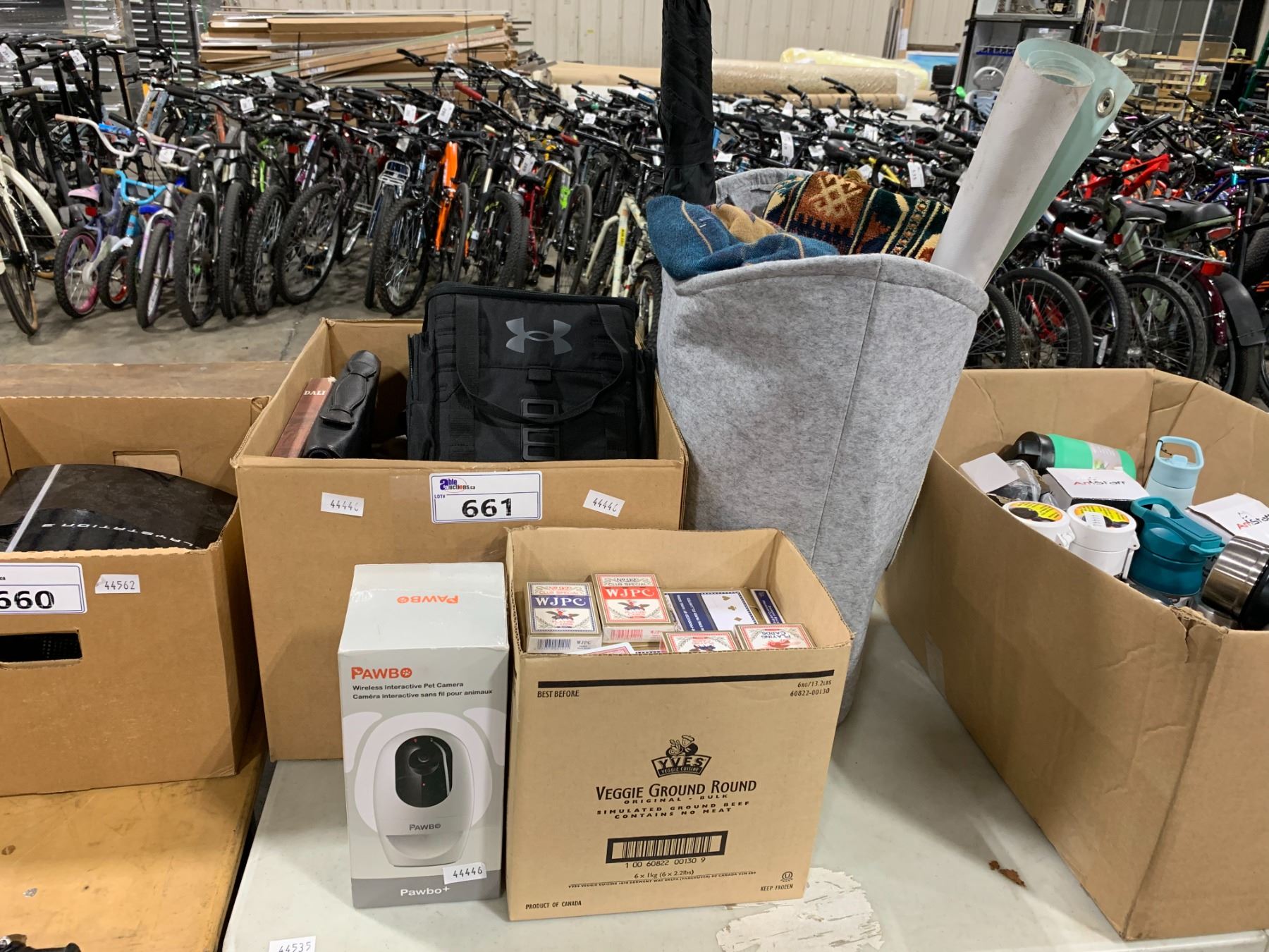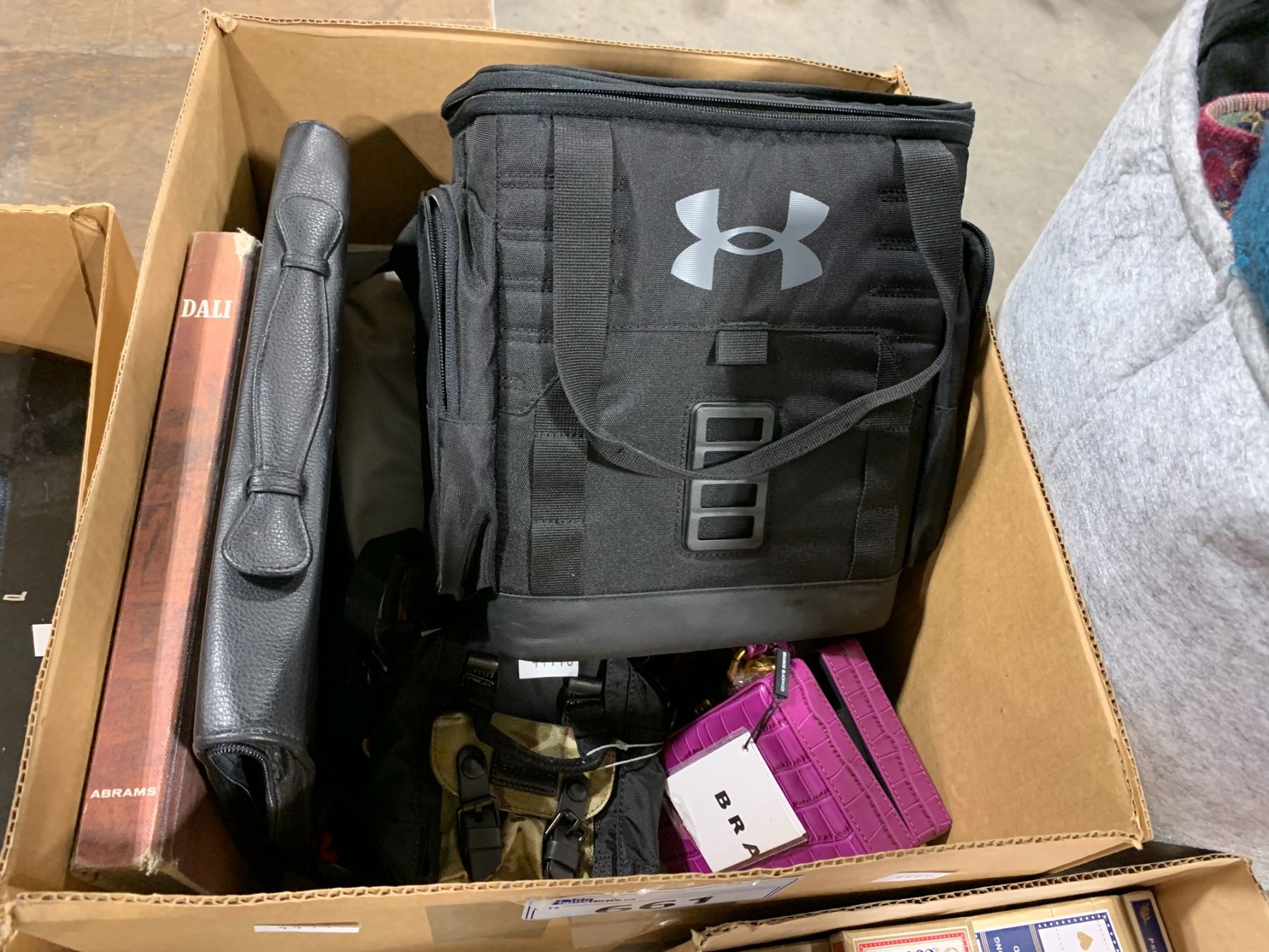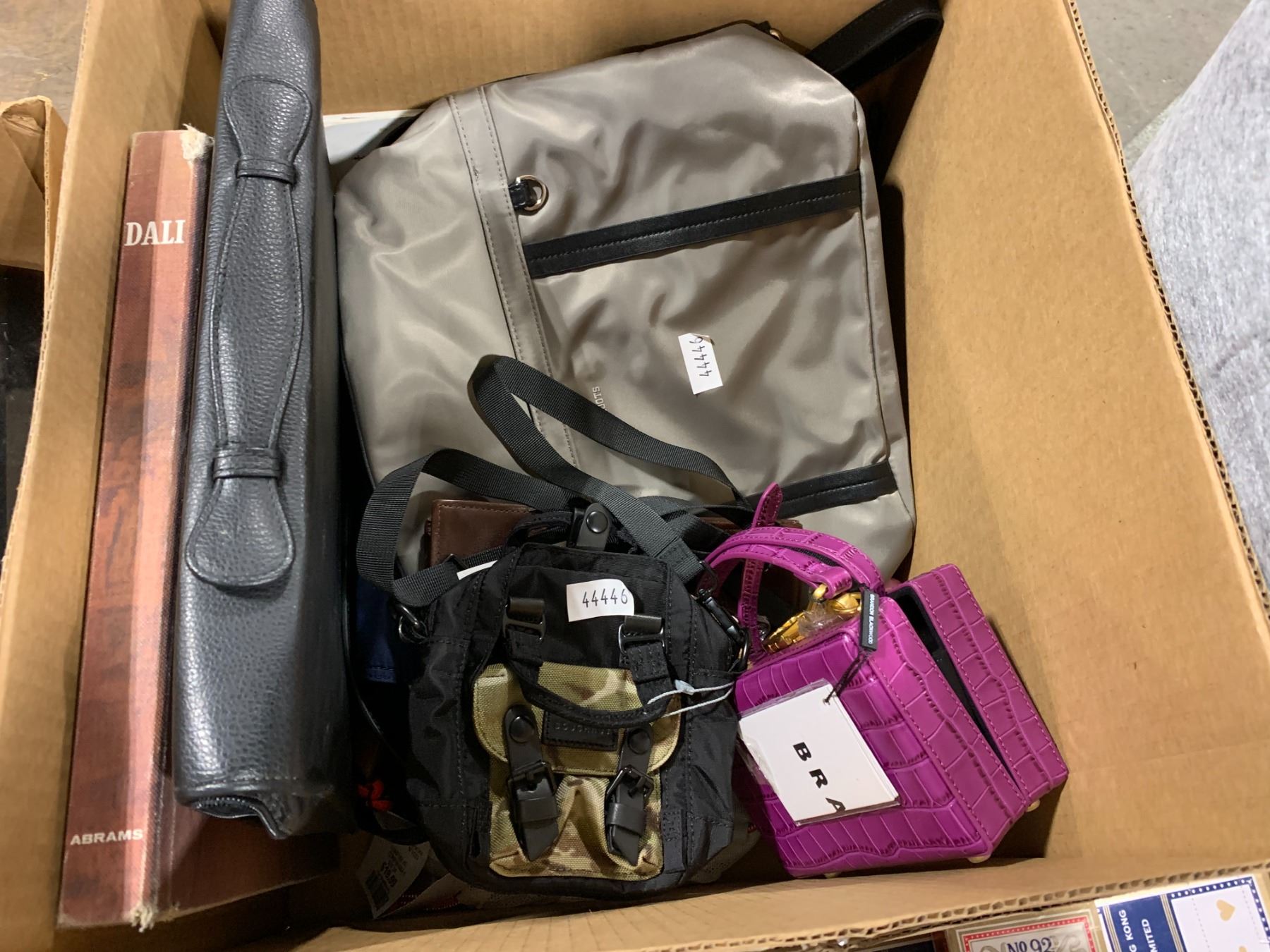 BOX OF ASSORTED LADIES BAG/PURSES, BOX OF WJPC PLAYING CARDS, PAWBO WIRELESS INTERACTIVE PET CAMERA & BAG OF FIRST AID BOX, CAP, UMBRELLA & MISC. ITEMS