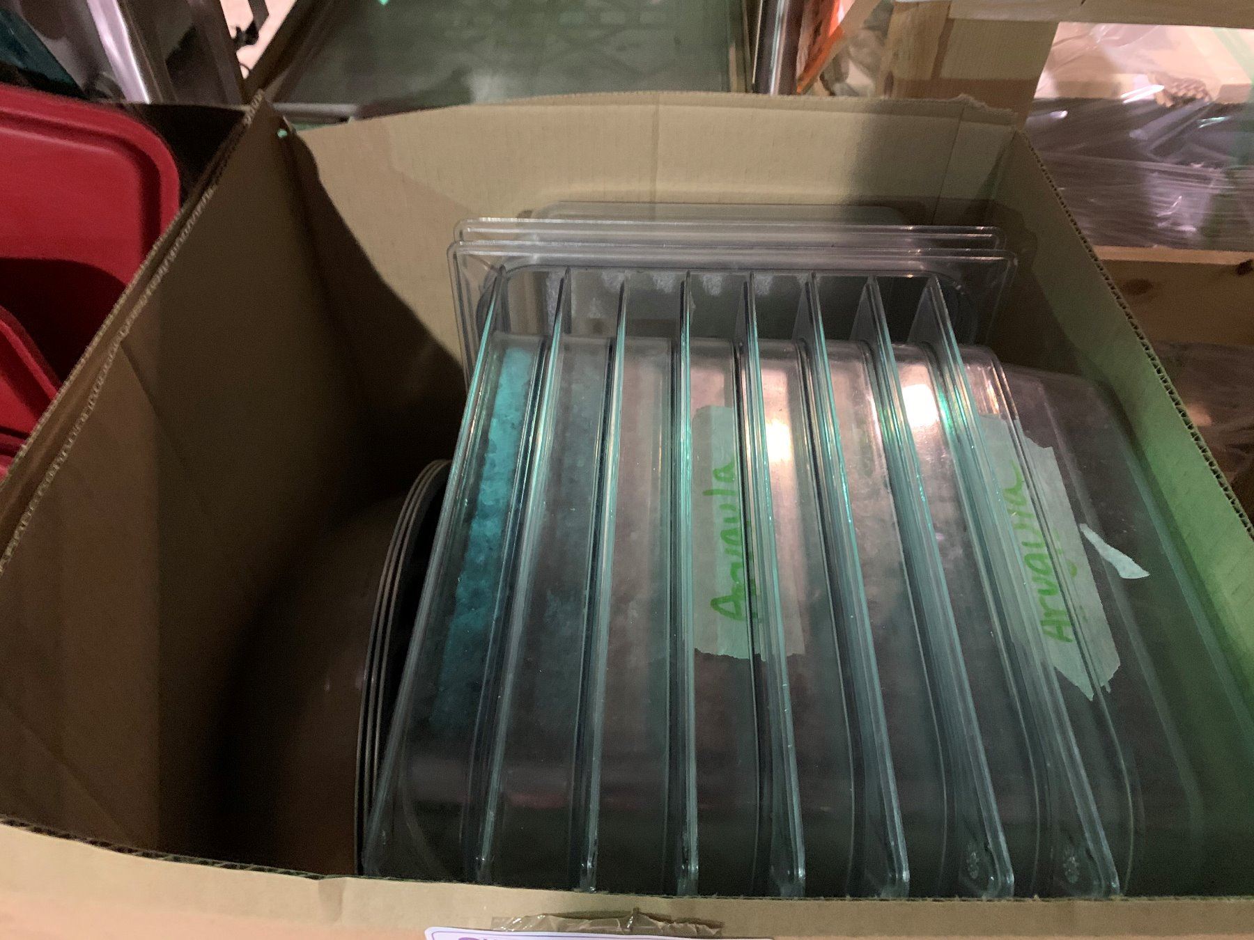 BOX OF ASSORTED LARGE CONDIMENT TRAYS & STAINLESS MIXING BOWLS