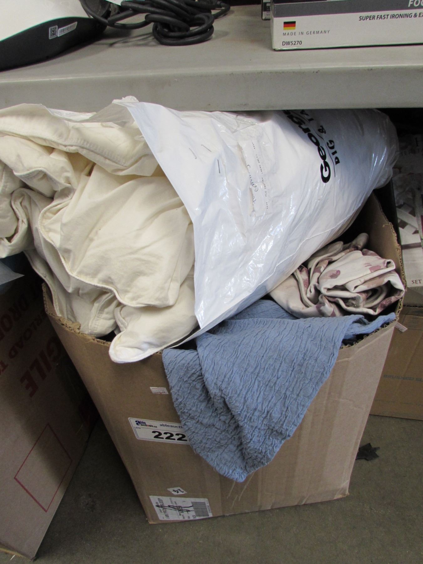 BOX OF ASSORTED LINEN, COMFORTER, ETC