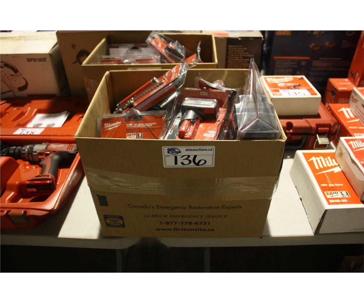 BOX OF ASSORTED MILWAUKEE BATTERIES AND ACCESSORIES