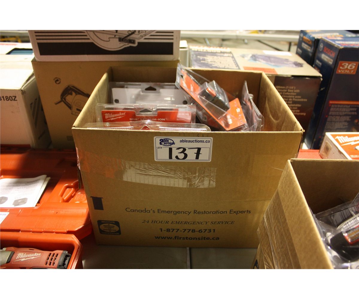 BOX OF ASSORTED MILWAUKEE BATTERIES AND ACCESSORIES
