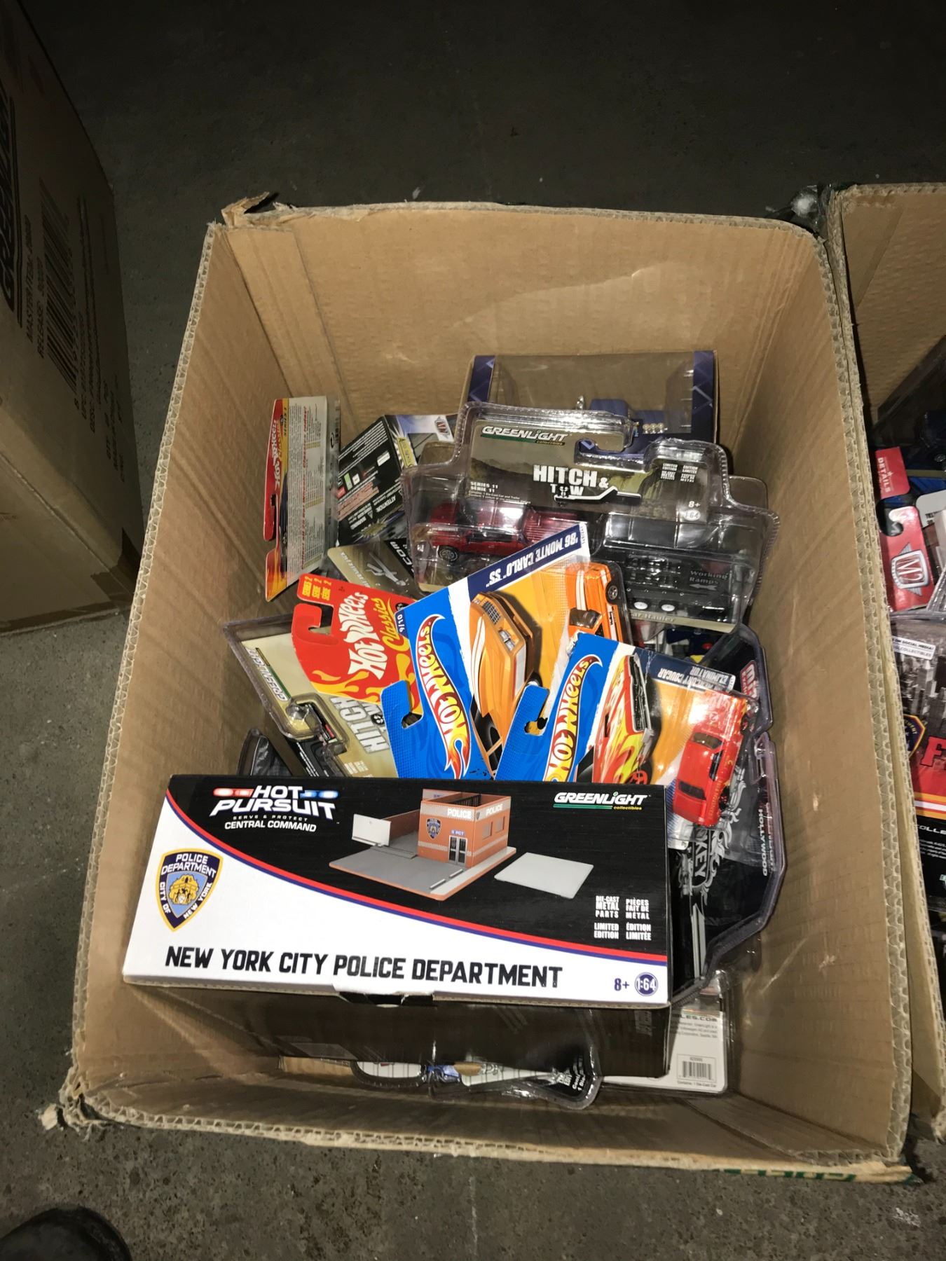 BOX OF ASSORTED NEW IN PACKAGING TOY CARS (GREENLIGHT, M2, HOT WHEELS)