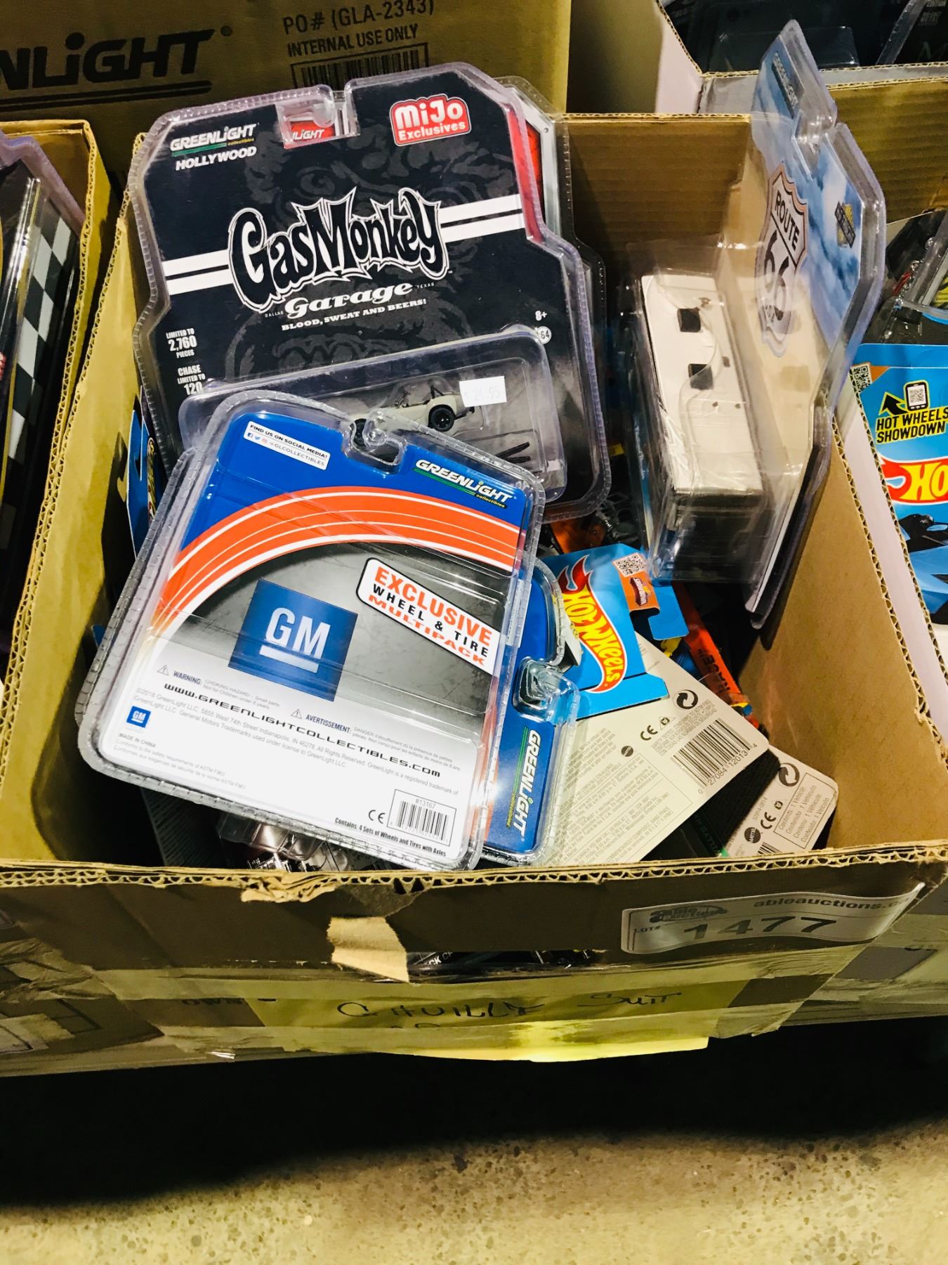 BOX OF ASSORTED NEW IN PACKAGING TOY CARS (HOT WHEELS, GREENLIGHT)