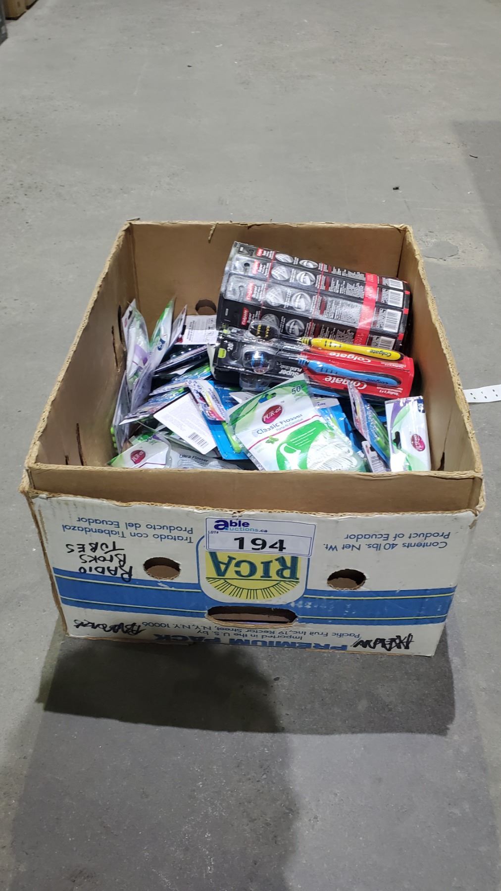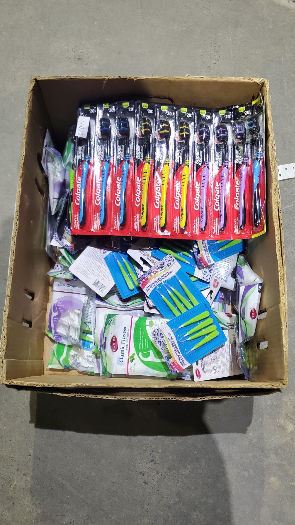 BOX OF ASSORTED ORAL CARE PRODUCTS INCLUDING; COLGATE SUPER FLEX BLACK MEDIUM TOOTHBRUSHES, PUR-EST INTERDENTAL BRUSHES, PUR-EST CLASSIC FLOSSERS & MORE