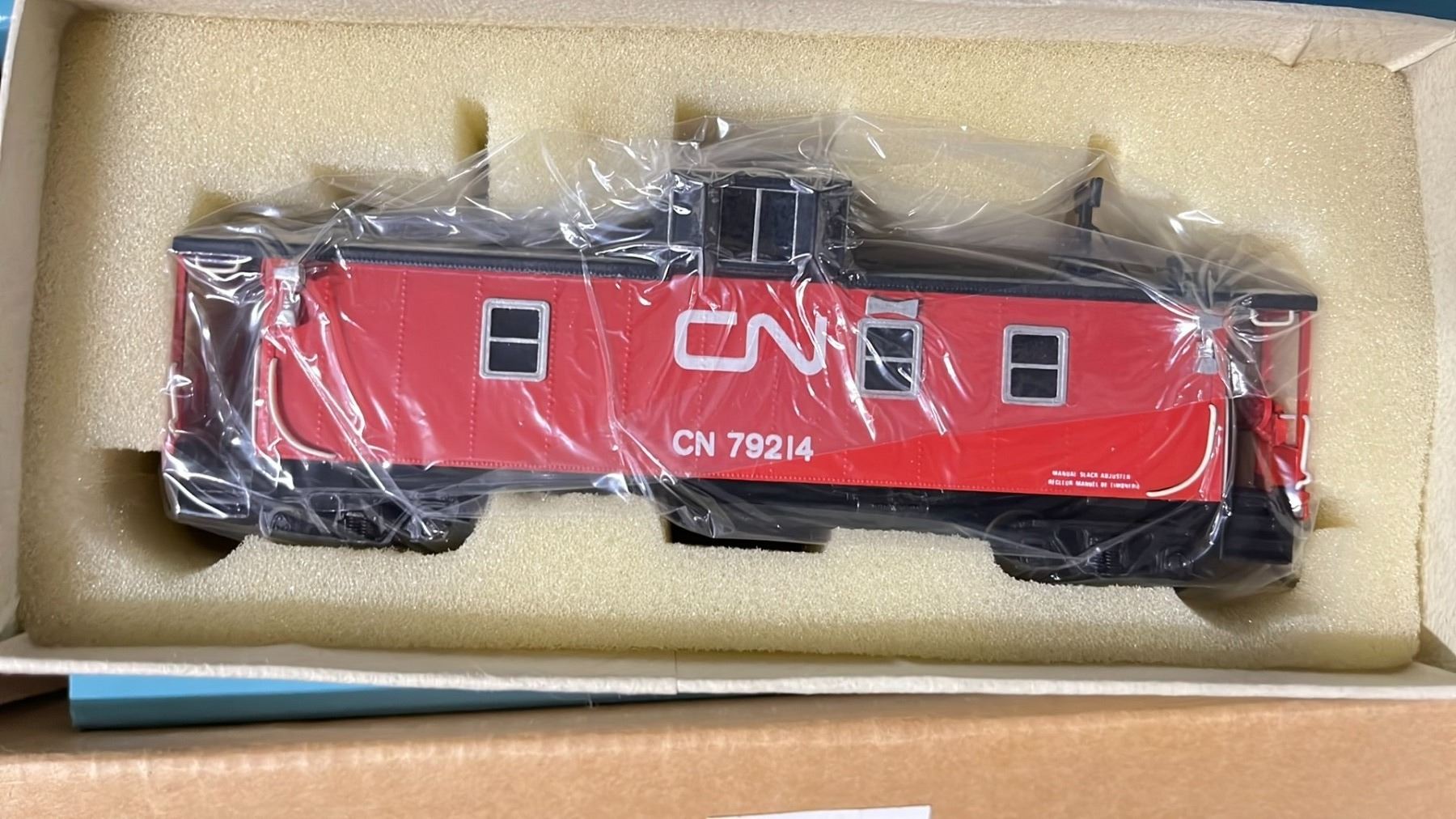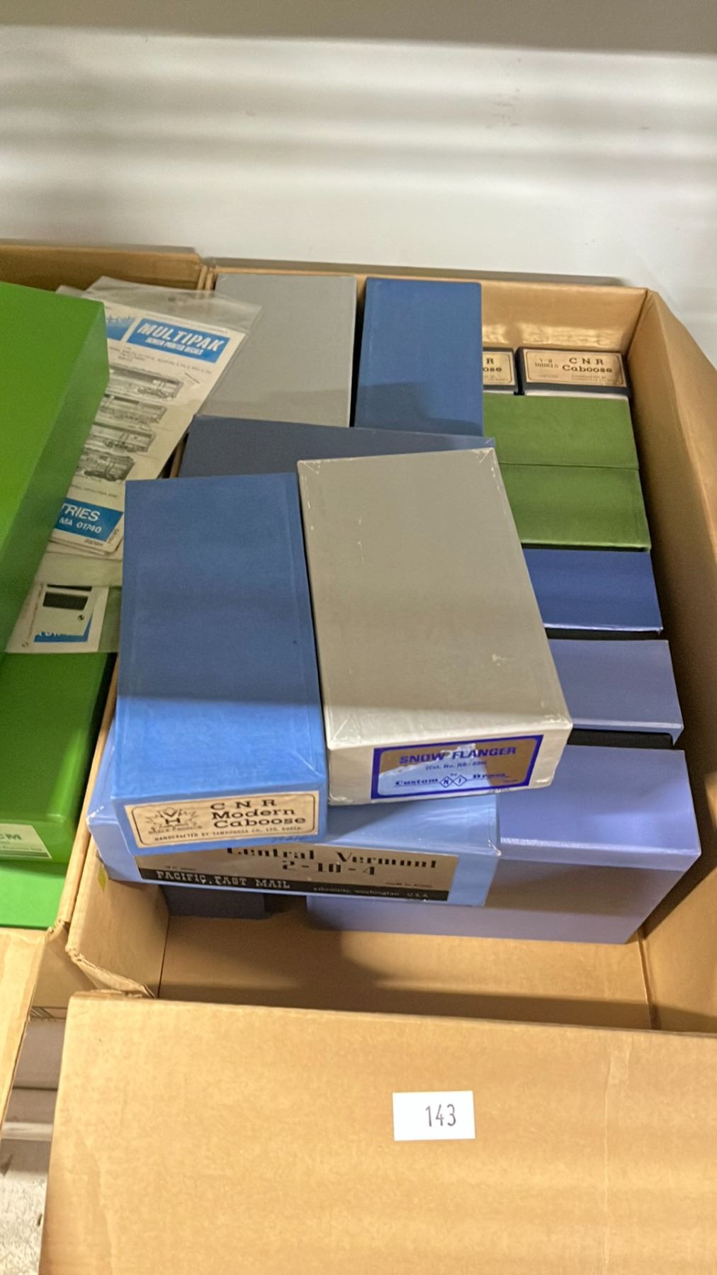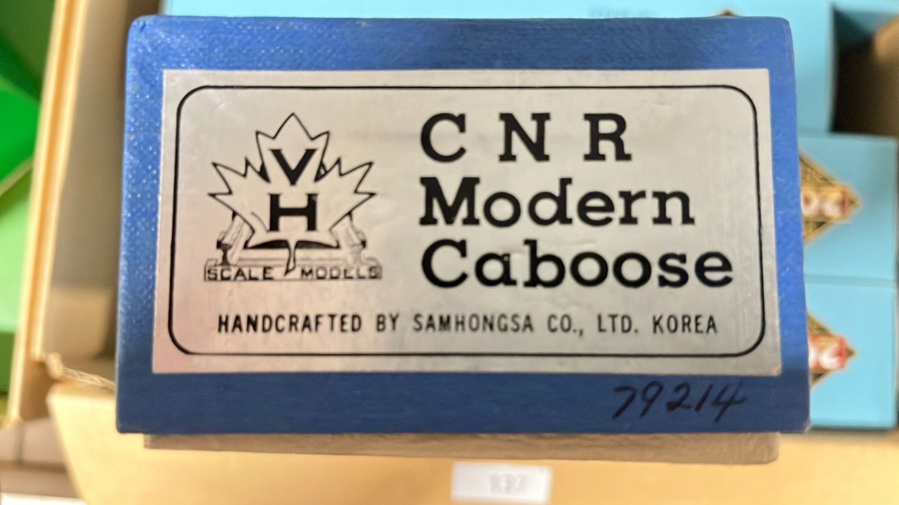 BOX OF ASSORTED PACIFIC FAST MAIL HO SCALE MODEL TRAINS, CUSTOM BRASS SNOW FLANGERS & CNR MODERN CABOOSES