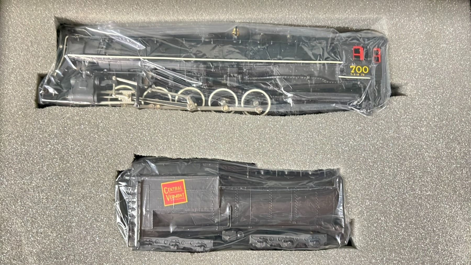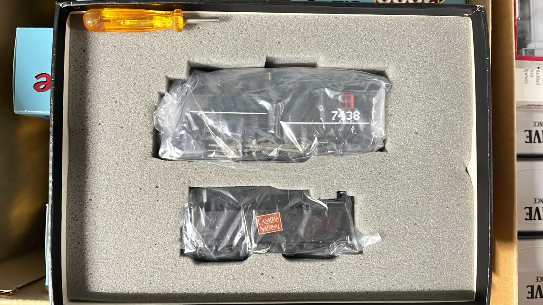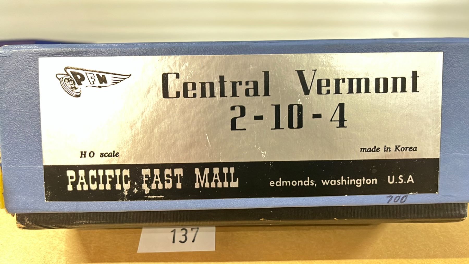 BOX OF ASSORTED PACIFIC FAST MAIL HO SCALE MODEL TRAINS, CUSTOM BRASS SNOW FLANGERS & CNR MODERN CABOOSES