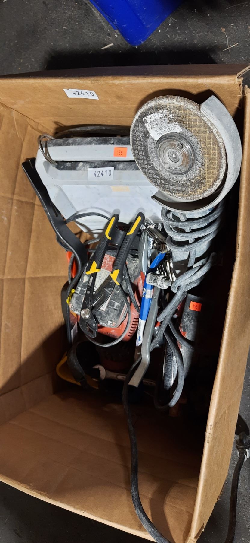 BOX OF ASSORTED POWER TOOLS AND ASSORTED HAND TOOLS INCLUDING 2 ANGLE GRINDERS, HILTI BATTERY AND CHARGER