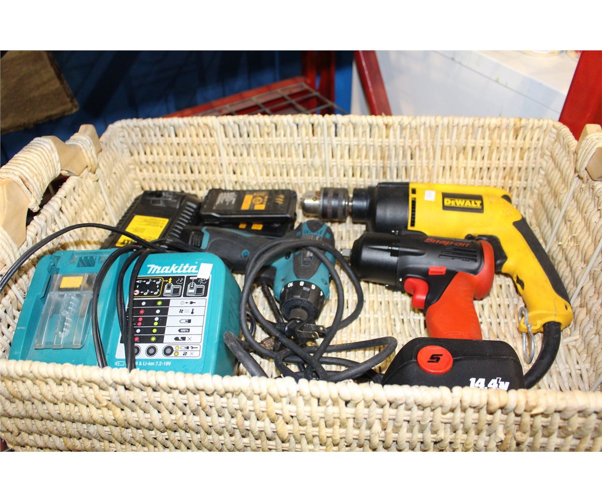 BOX OF ASSORTED POWER TOOLS; SNAP ON IMPACT WRENCH, DEWAULT DRILL AND MIKITA DRILL