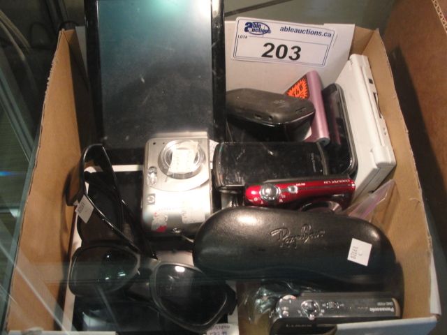 BOX OF ASSORTED SMART PHONES, DIGITAL CAMERAS, IPODS, READERS, SUNGLASSES, ETC