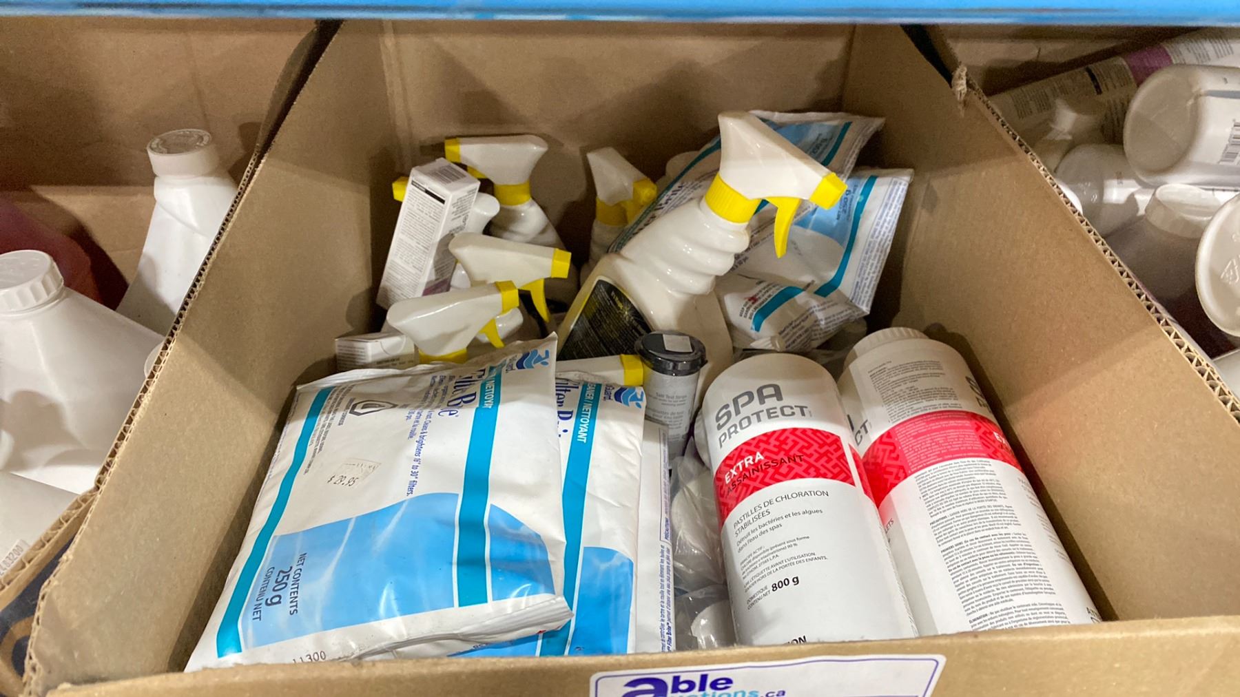 BOX OF ASSORTED SPA/POOL CHEMICALS, CLEANERS & TEST STRIPS