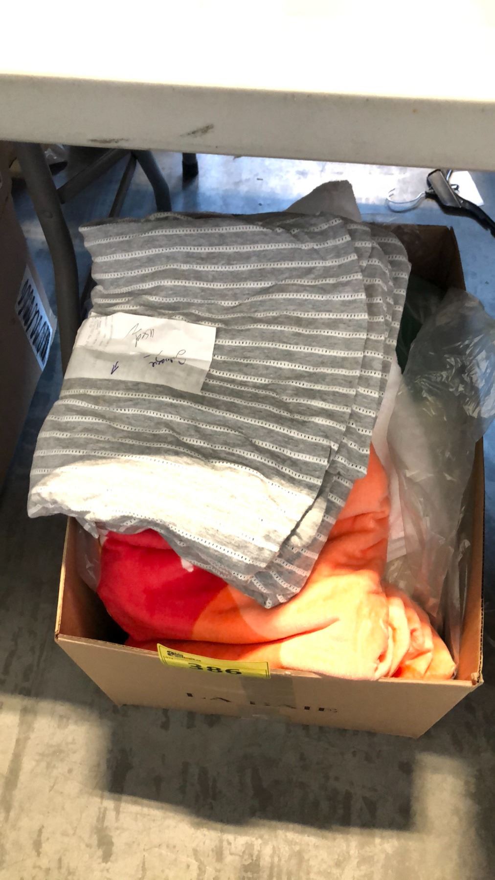 BOX OF ASSORTED TOWELS, CLOTHING, BEDDING AND BAG