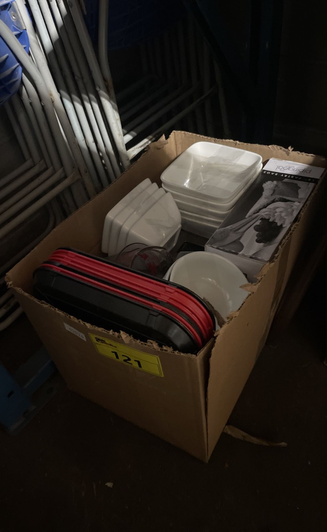 BOX OF ASSORTED TRAYS, BOWLS & KITCHEN GLASSWARE