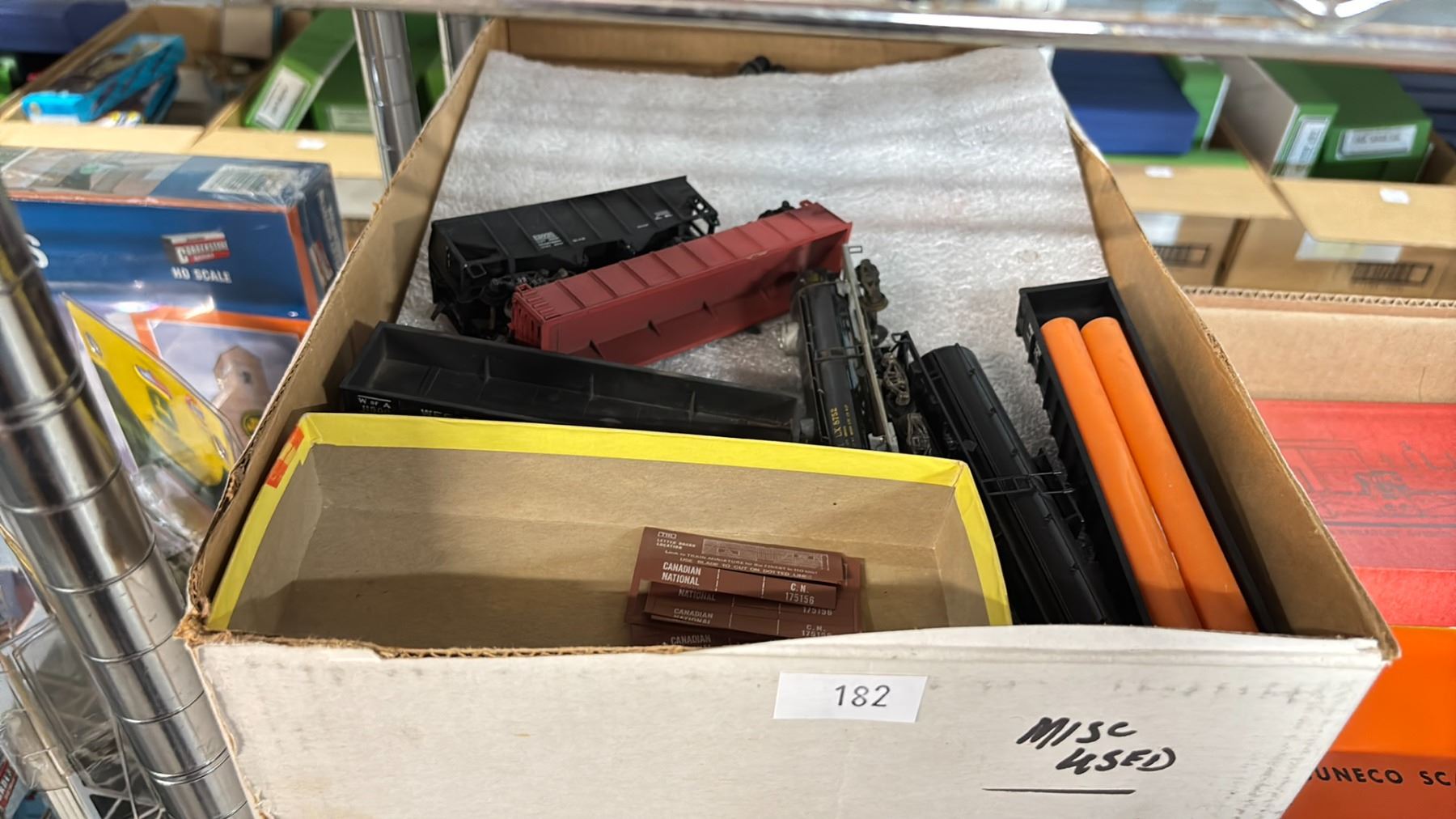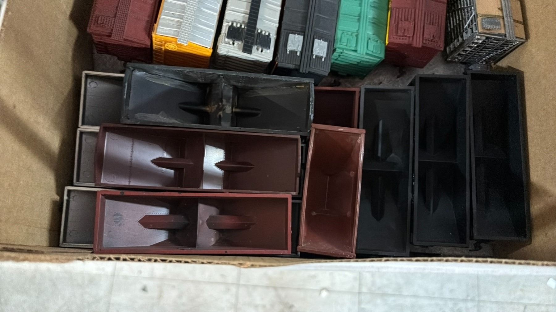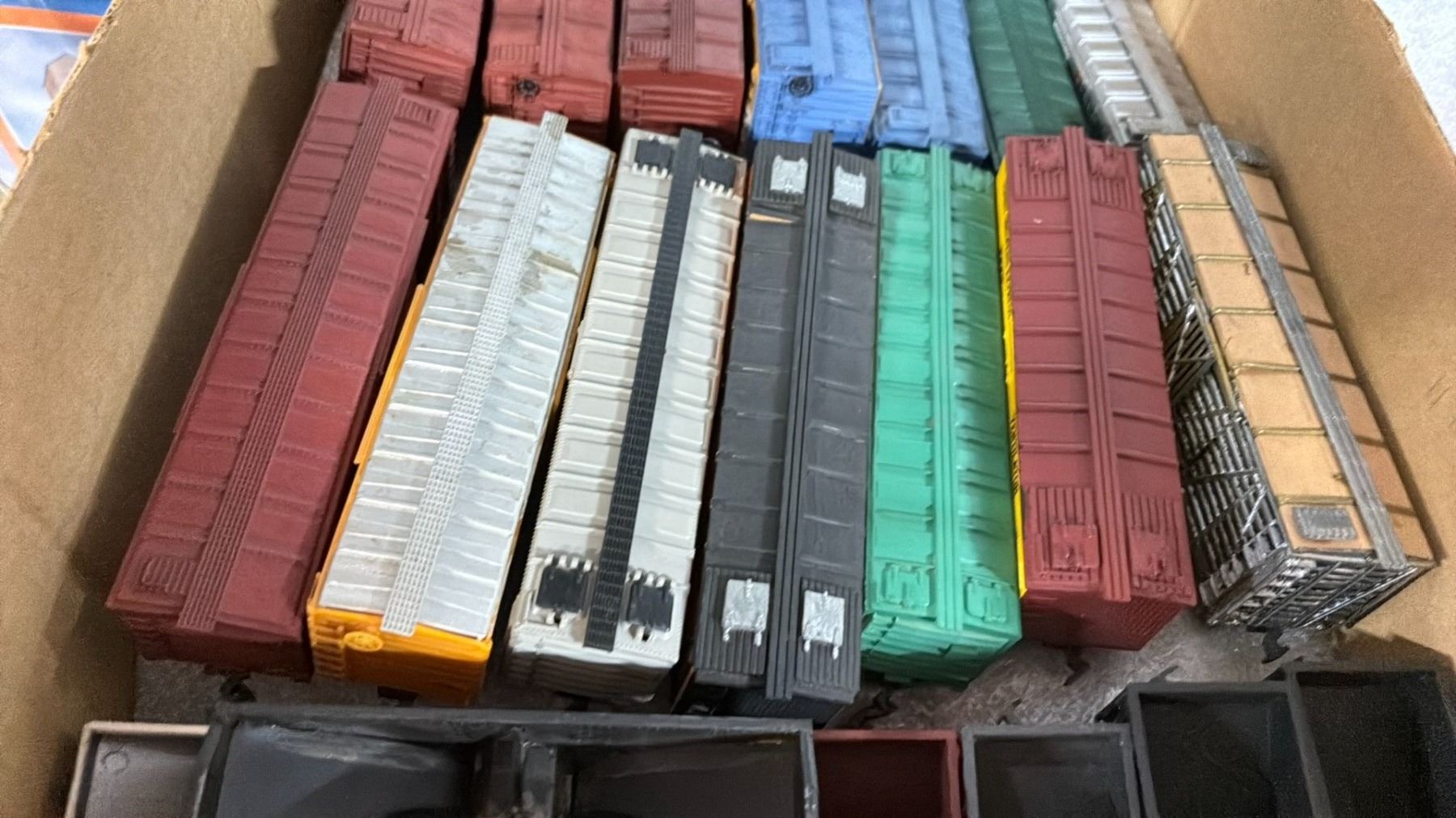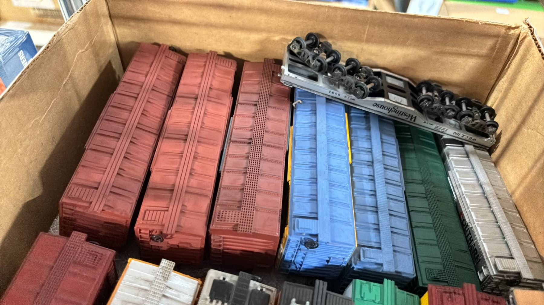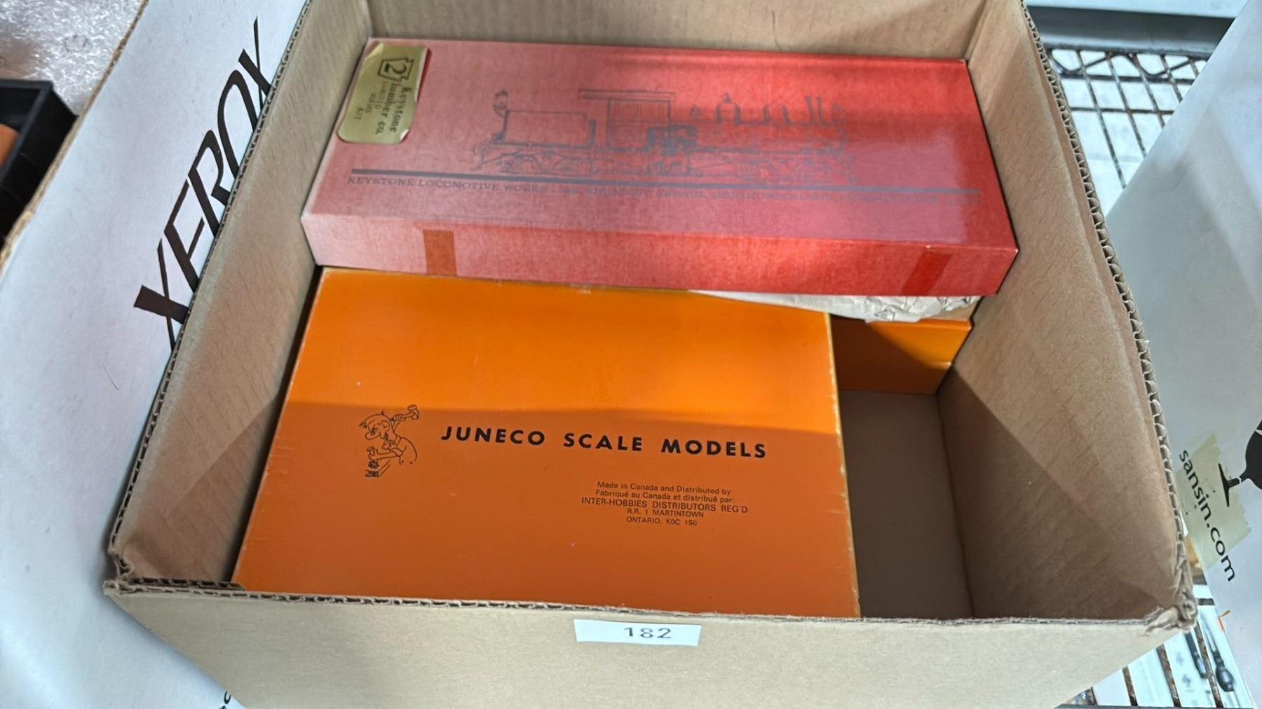 BOX OF ASSORTED UNBOXED HO SCALE MODEL TRAINS & BOX OF JUNECO SCALE MODELS CUT STONE