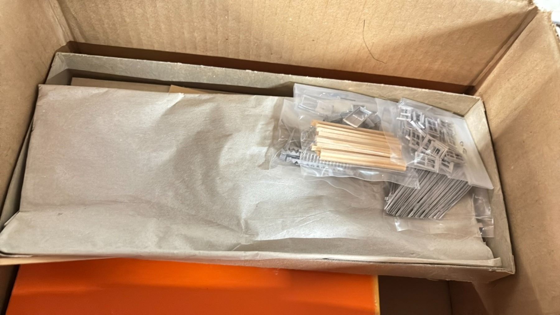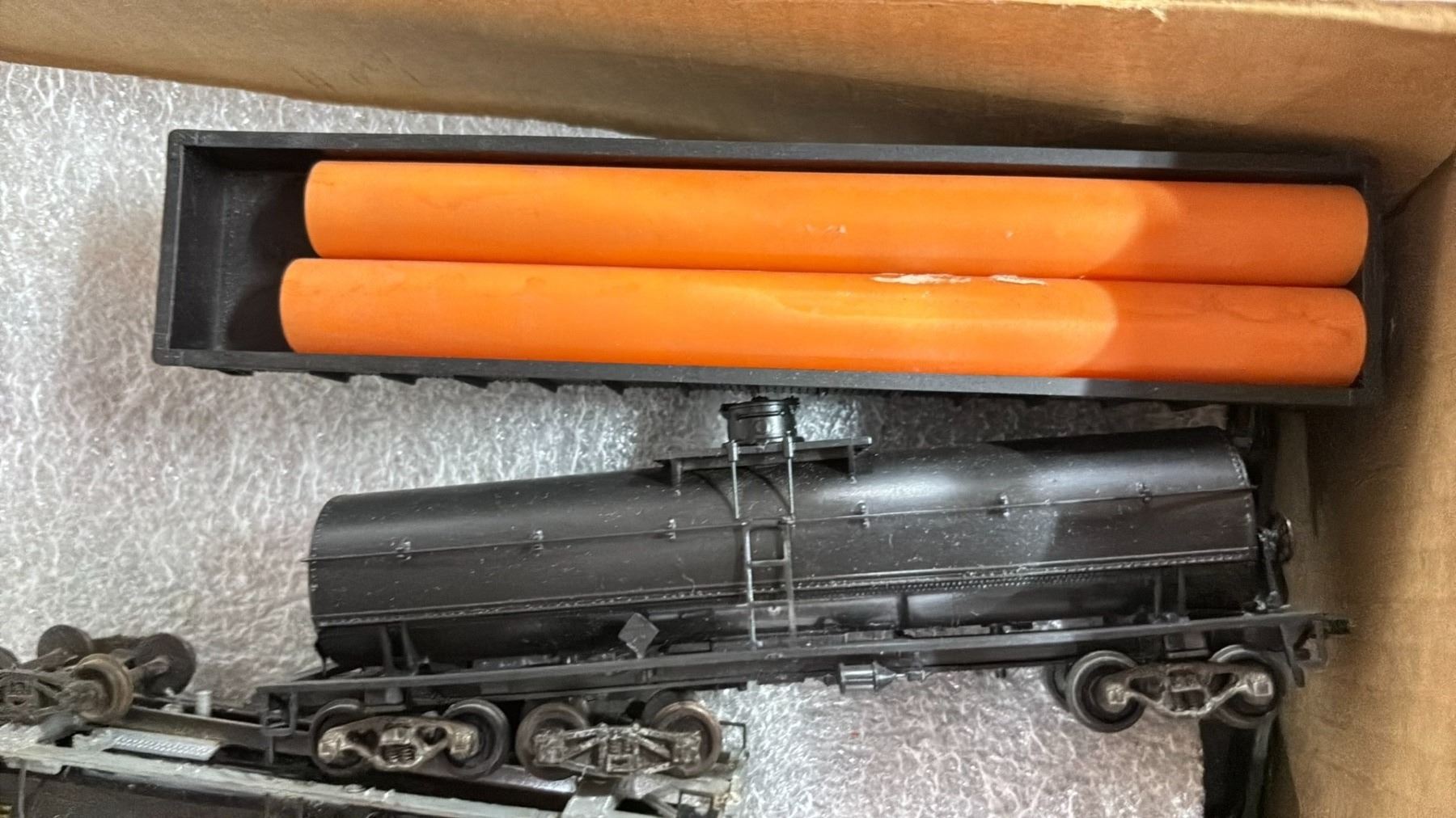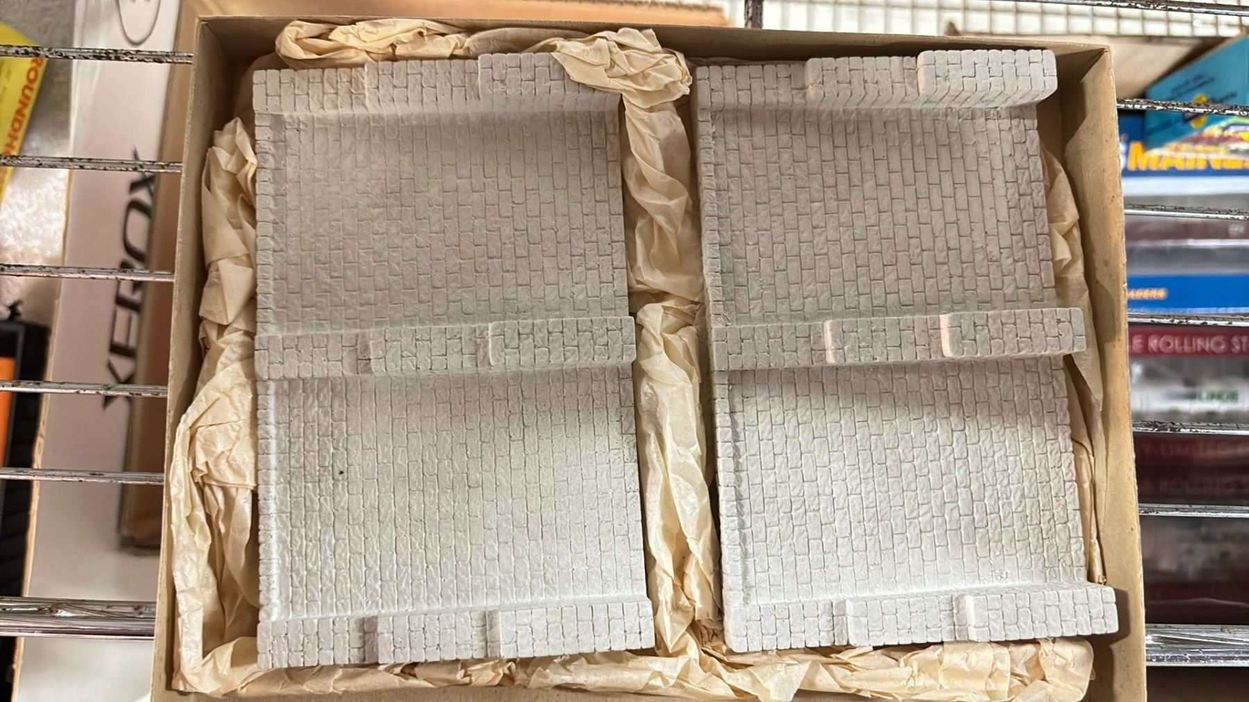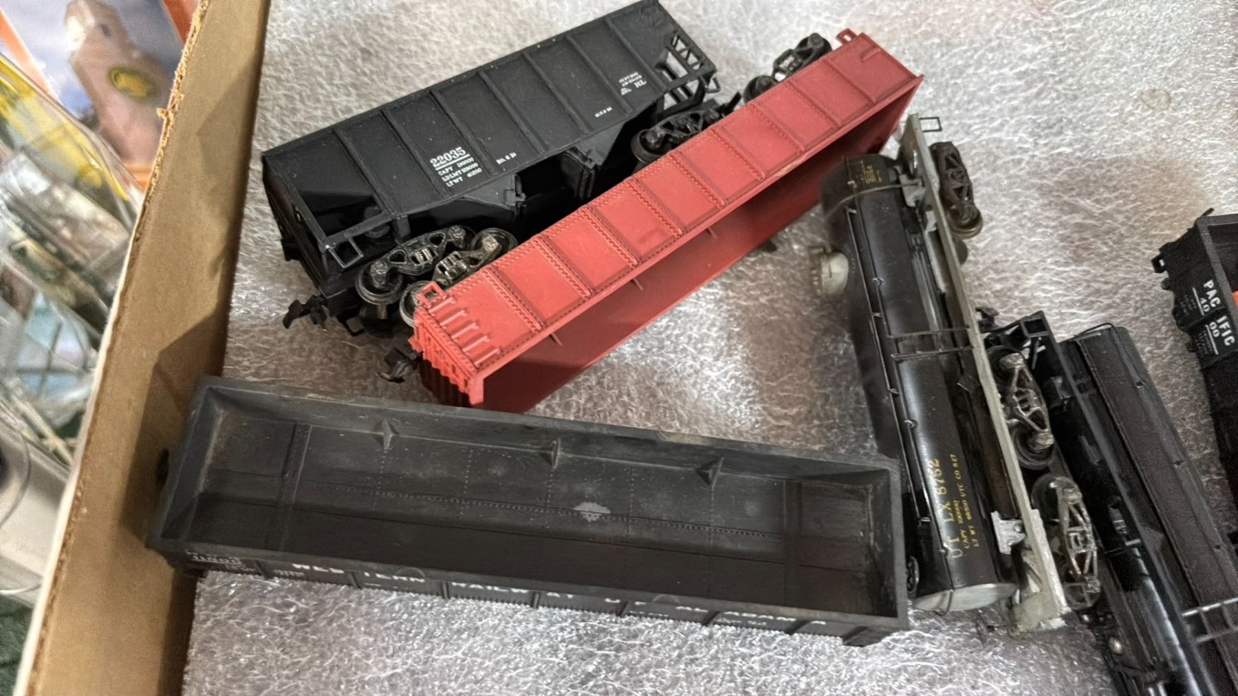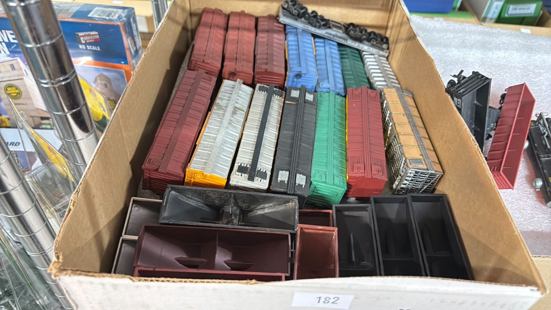 BOX OF ASSORTED UNBOXED HO SCALE MODEL TRAINS & BOX OF JUNECO SCALE MODELS CUT STONE