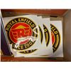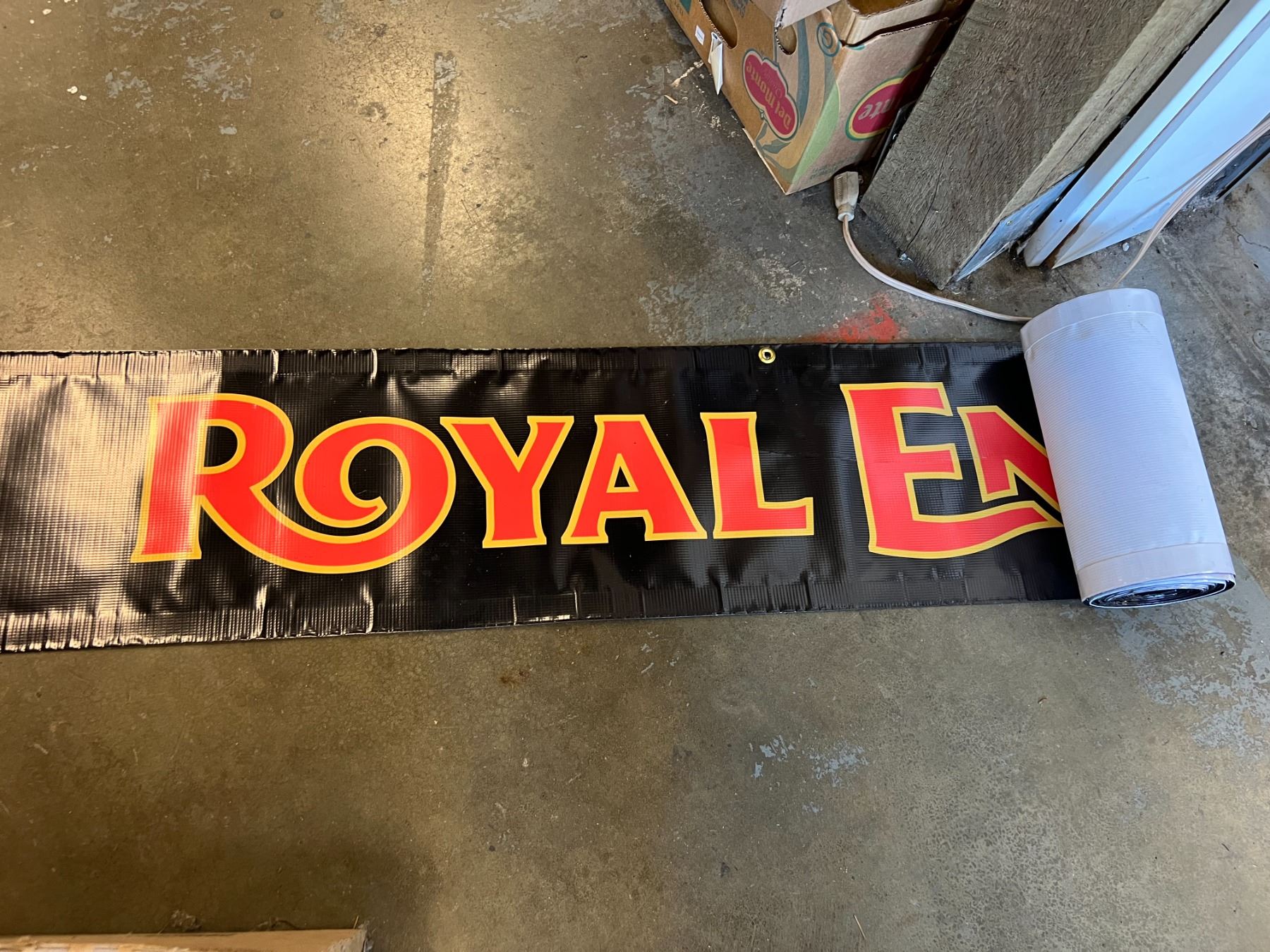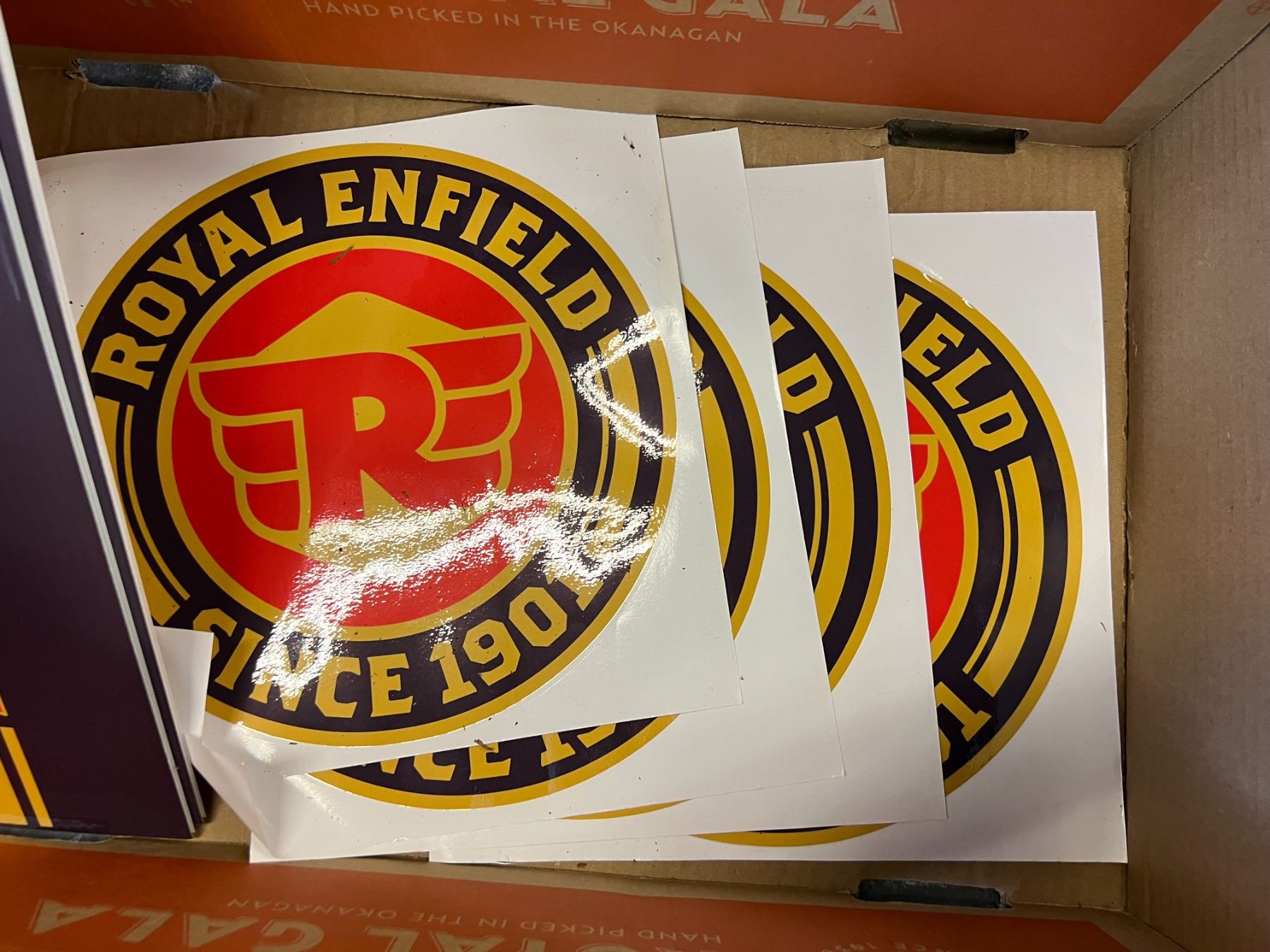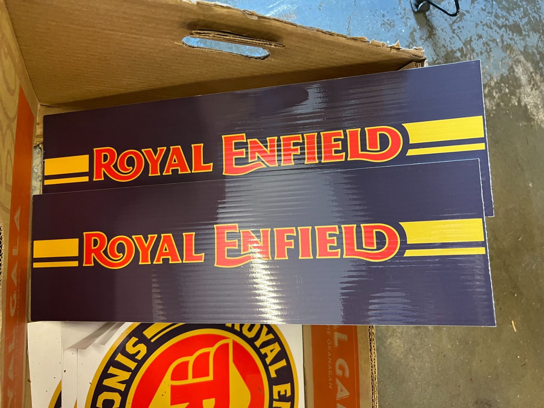BOX OF ASSTD ROYAL ENFIELD STICKERS/SIGNAGE, BANNER (25' X 1') & COLLAPSIBLE SIGN