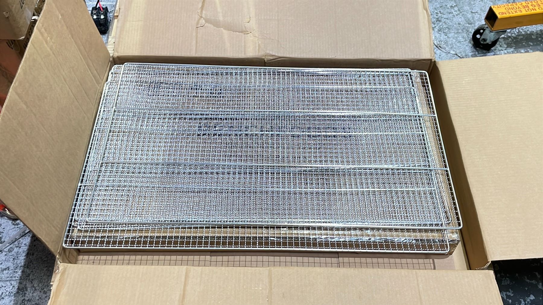 BOX OF BENCHFOODS STAINLESS STEEL 33 W X 19.5 D MESH TRAYS