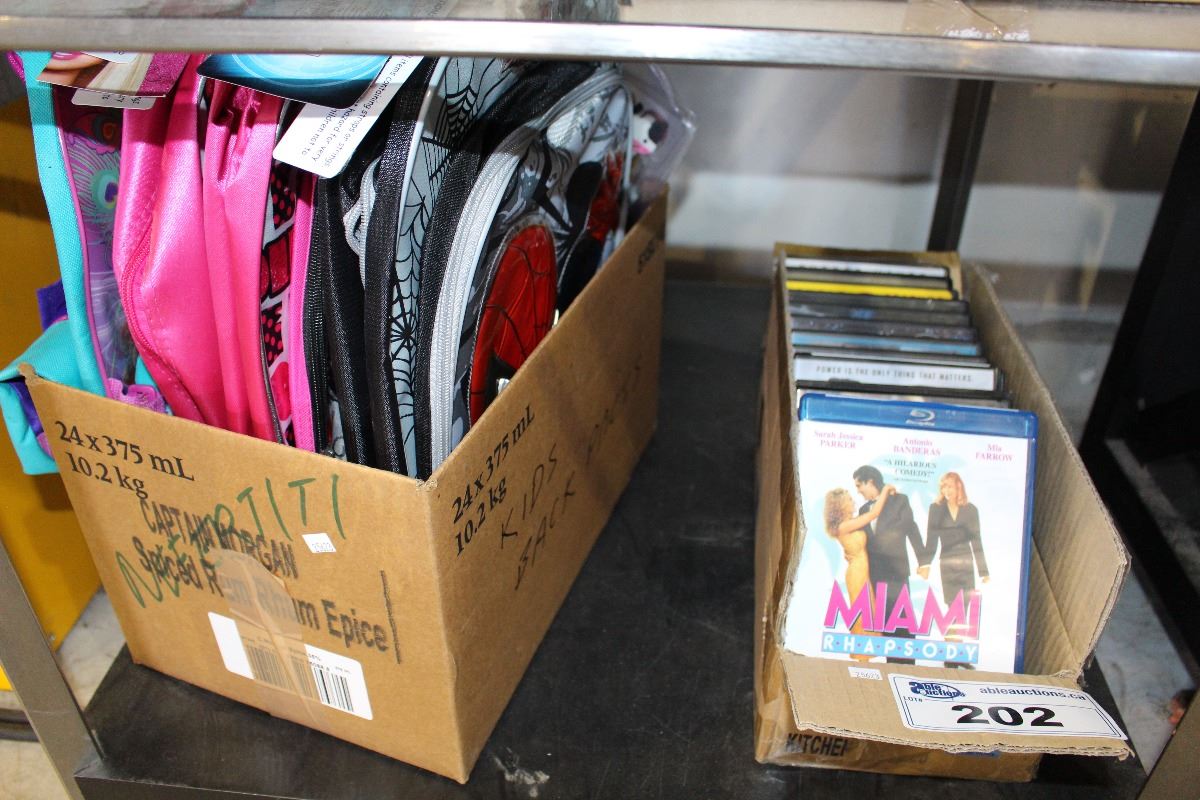 BOX OF BLURAY DVDS AND BOX OF BACKPACKS