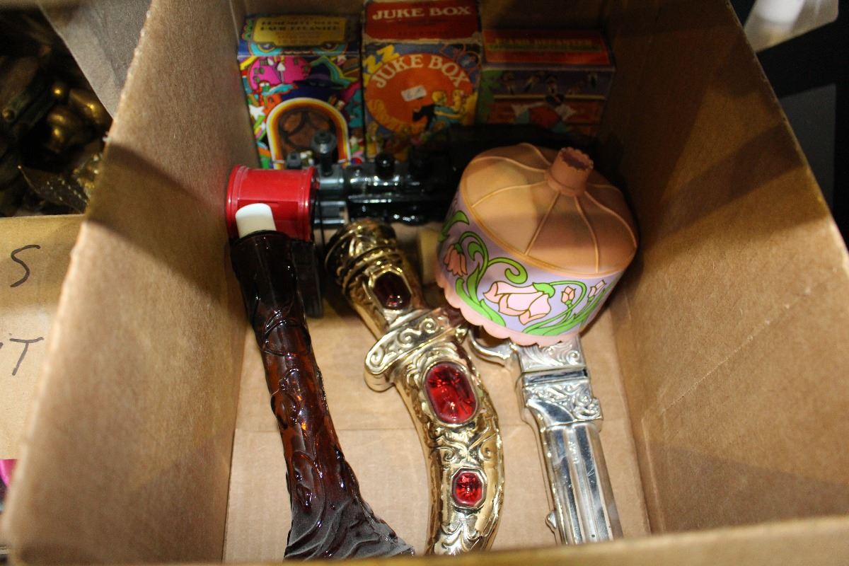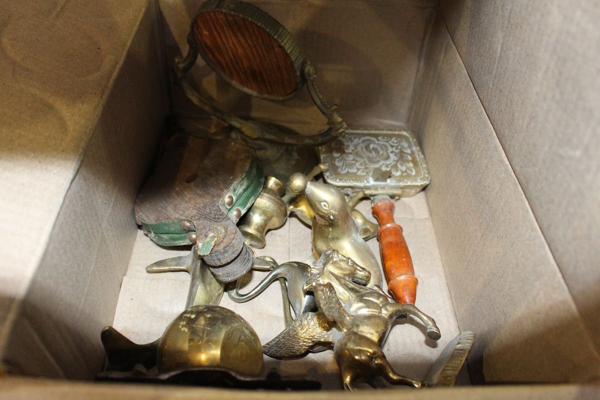 BOX OF BRASS ORNAMENTS AND BOX OF AVON COLLECTABLES
