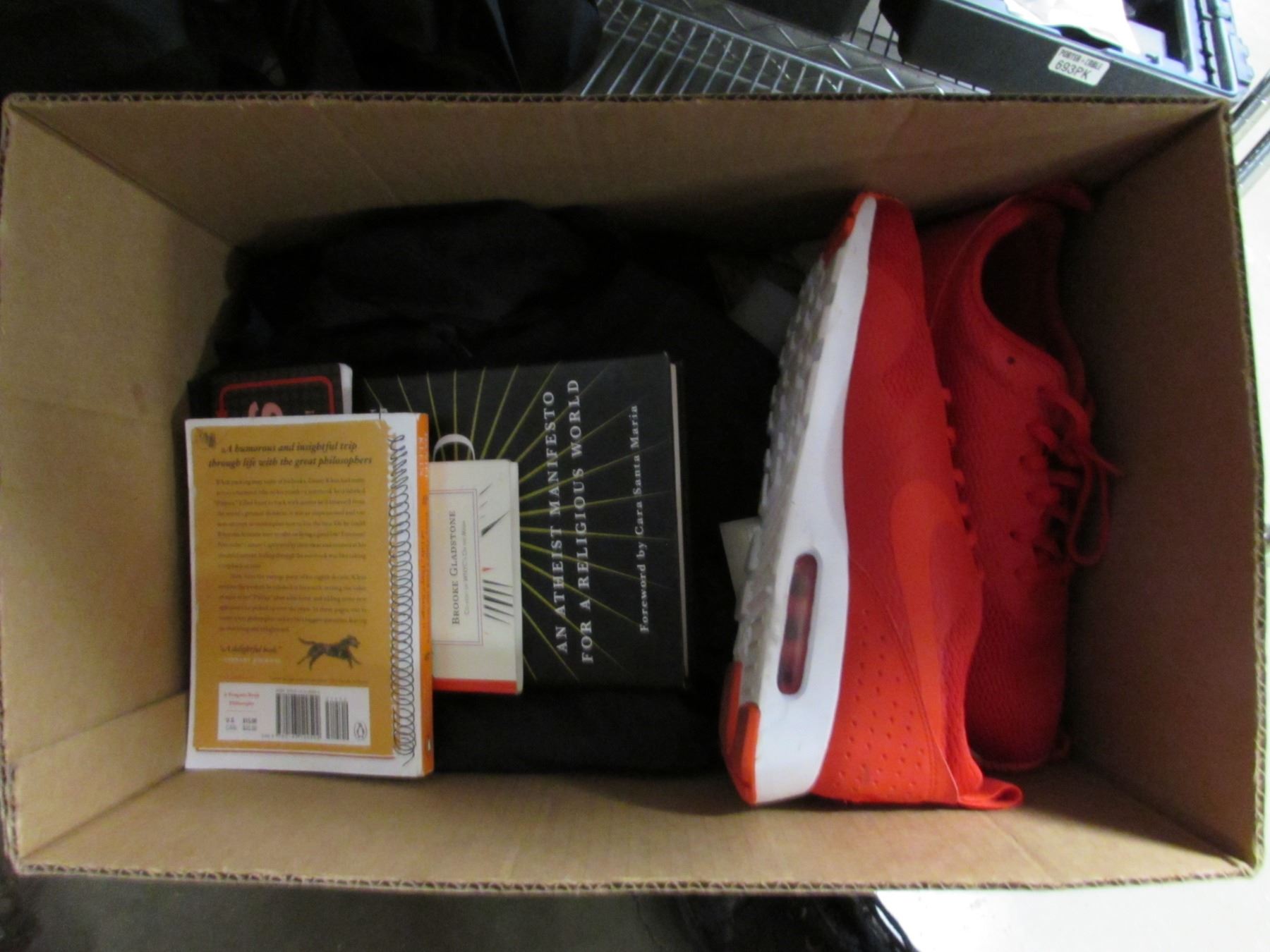 BOX OF CLOTHES, LIGHTERS, SHOES & BOOKS
