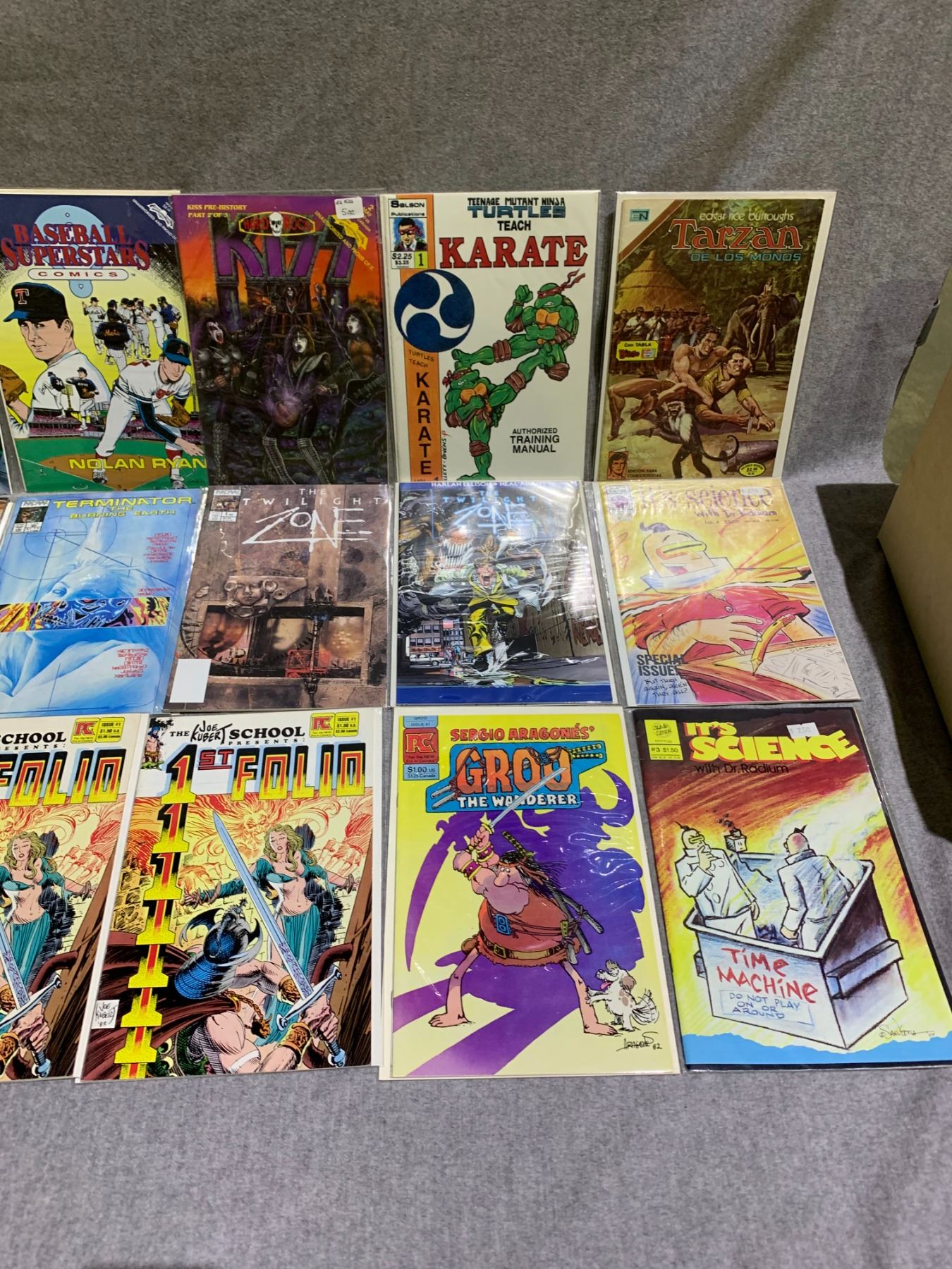 BOX OF COMIC BOOKS INCLUDING; THE TERMINATOR, TWILIGHT ZONE, THIRD WORLD WAR, FOG CITY, BASEBALL STARS, TARZAN AND MORE STARS, TARZAN AND MORE