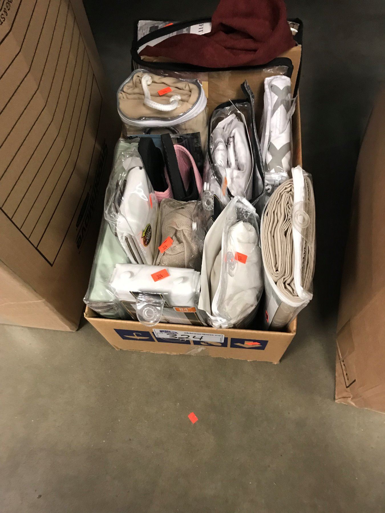 BOX OF CURTAIN PANELS, SUREFIT FURNITURE COVER, SLIP ONS, GROMMENT PANELS & ASSORTED LINEN B1