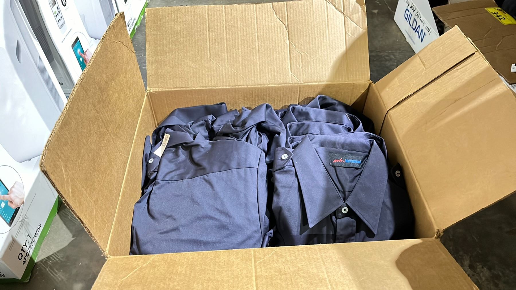 BOX OF DARK BLUE COLLARED SHIRTS (VARIOUS SIZES)