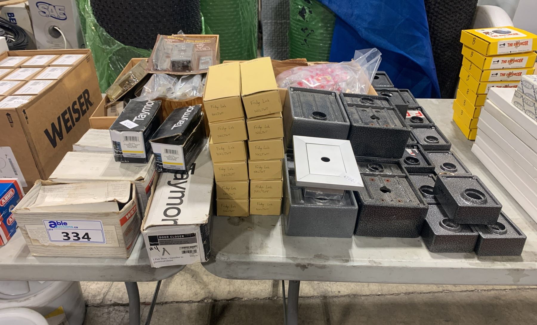 BOX OF DOOR GUARD SETS, WEISER DOOR KNOBS, TAYMOR DOOR KNOBS, DOOR CLOSERS, & ASSORTED COMMERCIAL LOCK BOXES