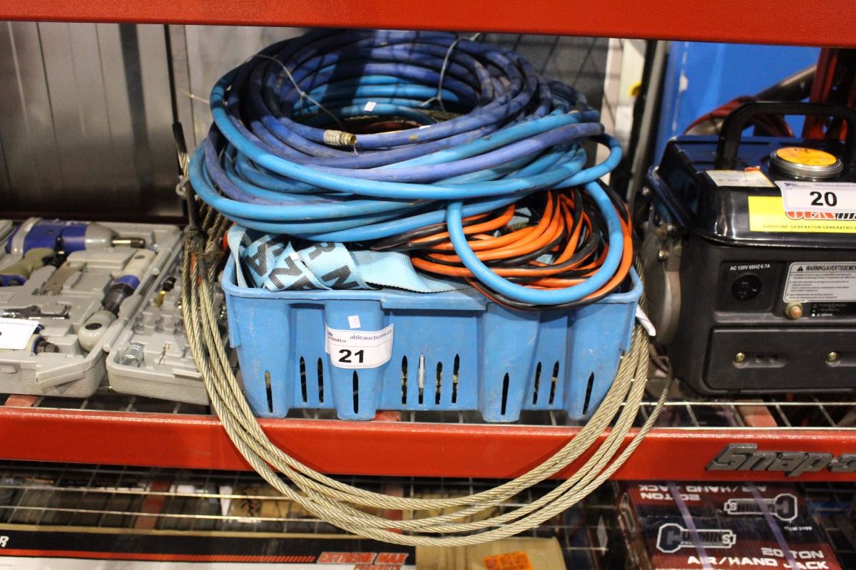 BOX OF EXTENSION CORDS, AIR HOSE, STRAPS, ROPE, AND CABLE