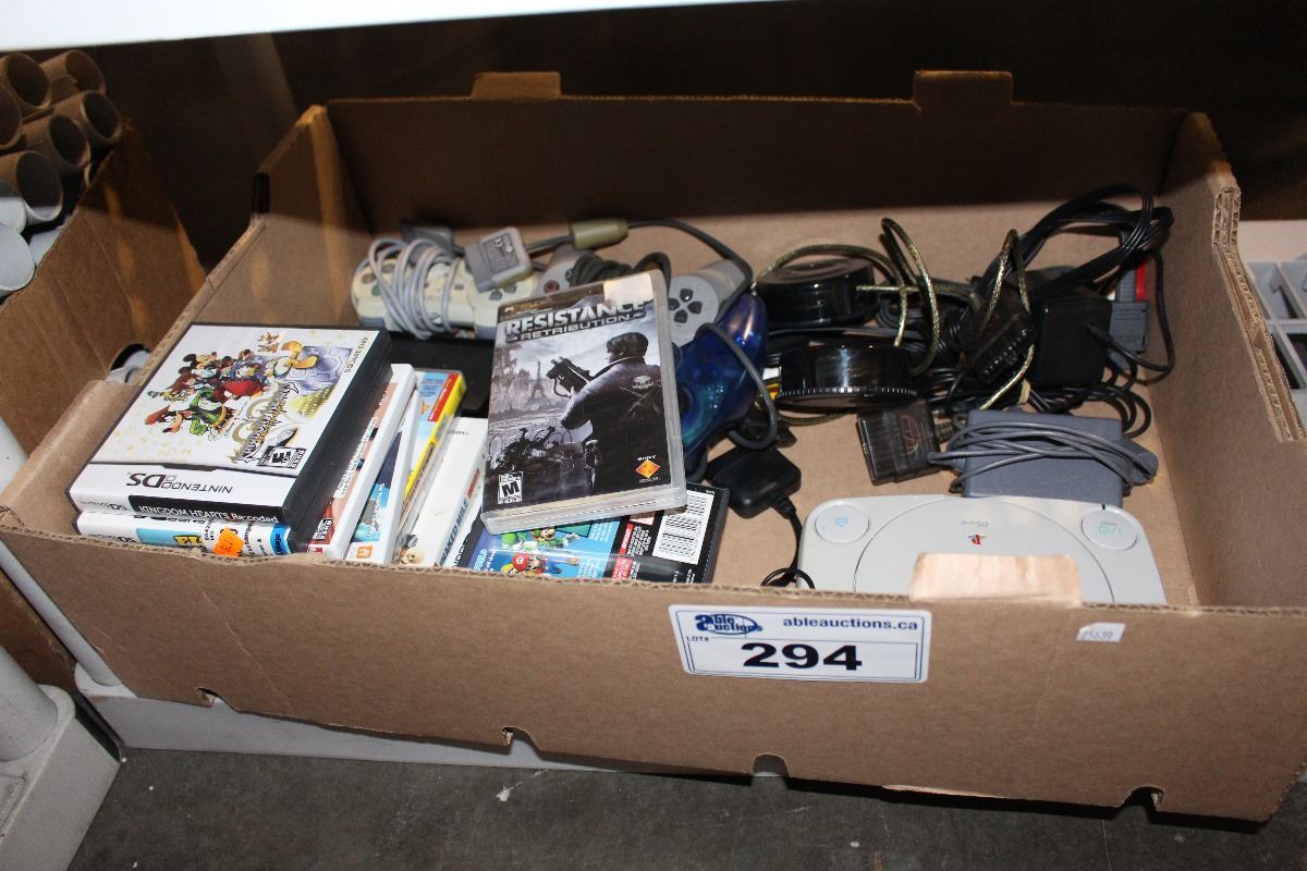 BOX OF GAMING SYSTEMS INCLUDING PS1 AND DS GAMES AND ACCESSORIES