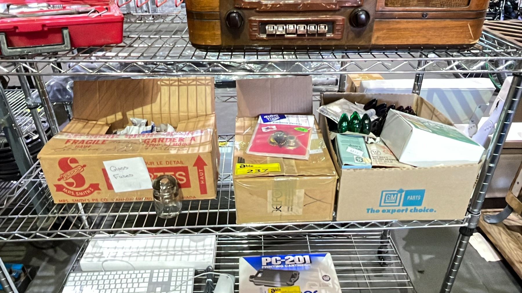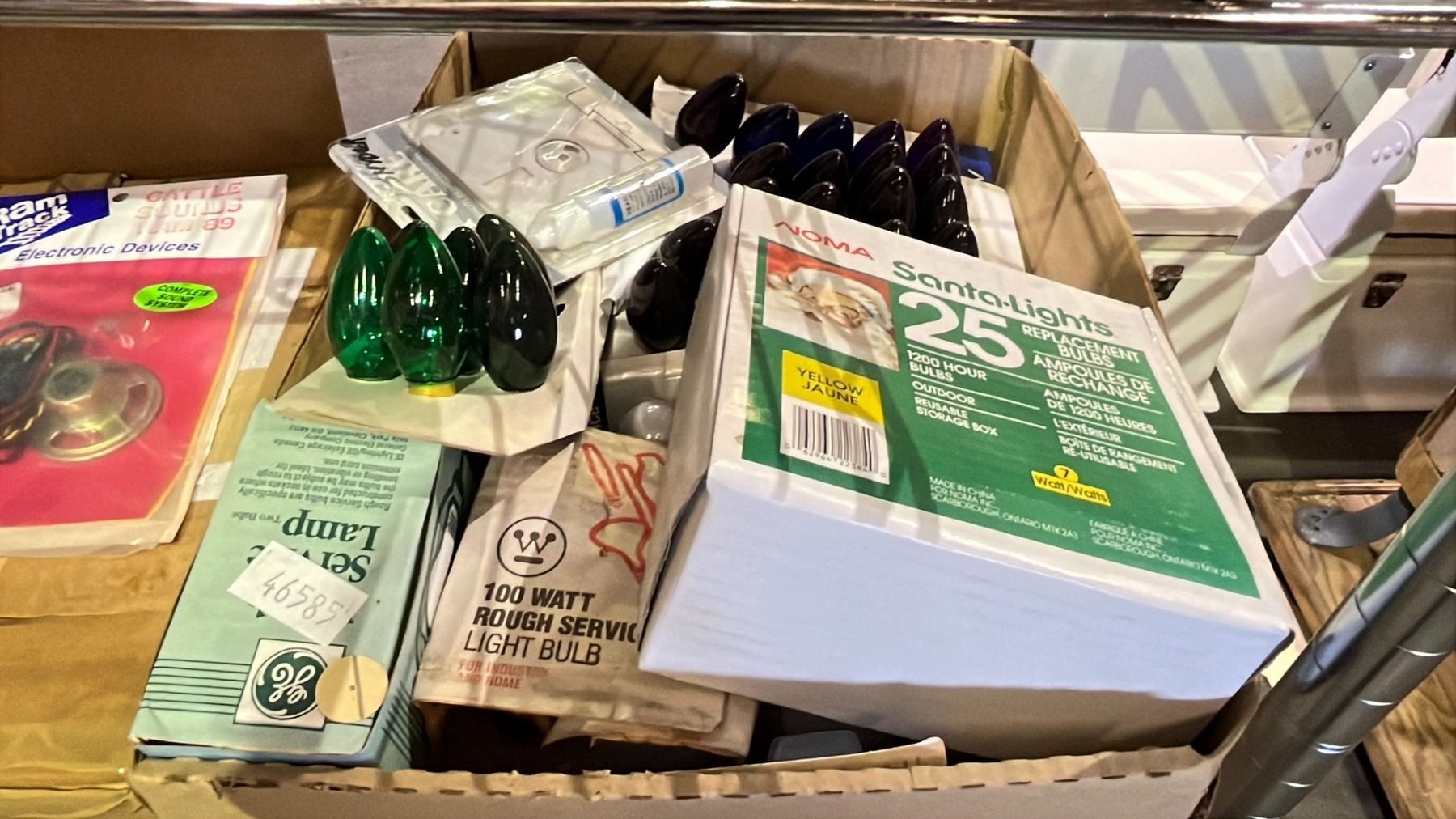 BOX OF GLASS INSULATORS, RAM TRUCK ELECTRONIC DEVICES & BOX OF ASSORTED CHRISTMAS BULBS