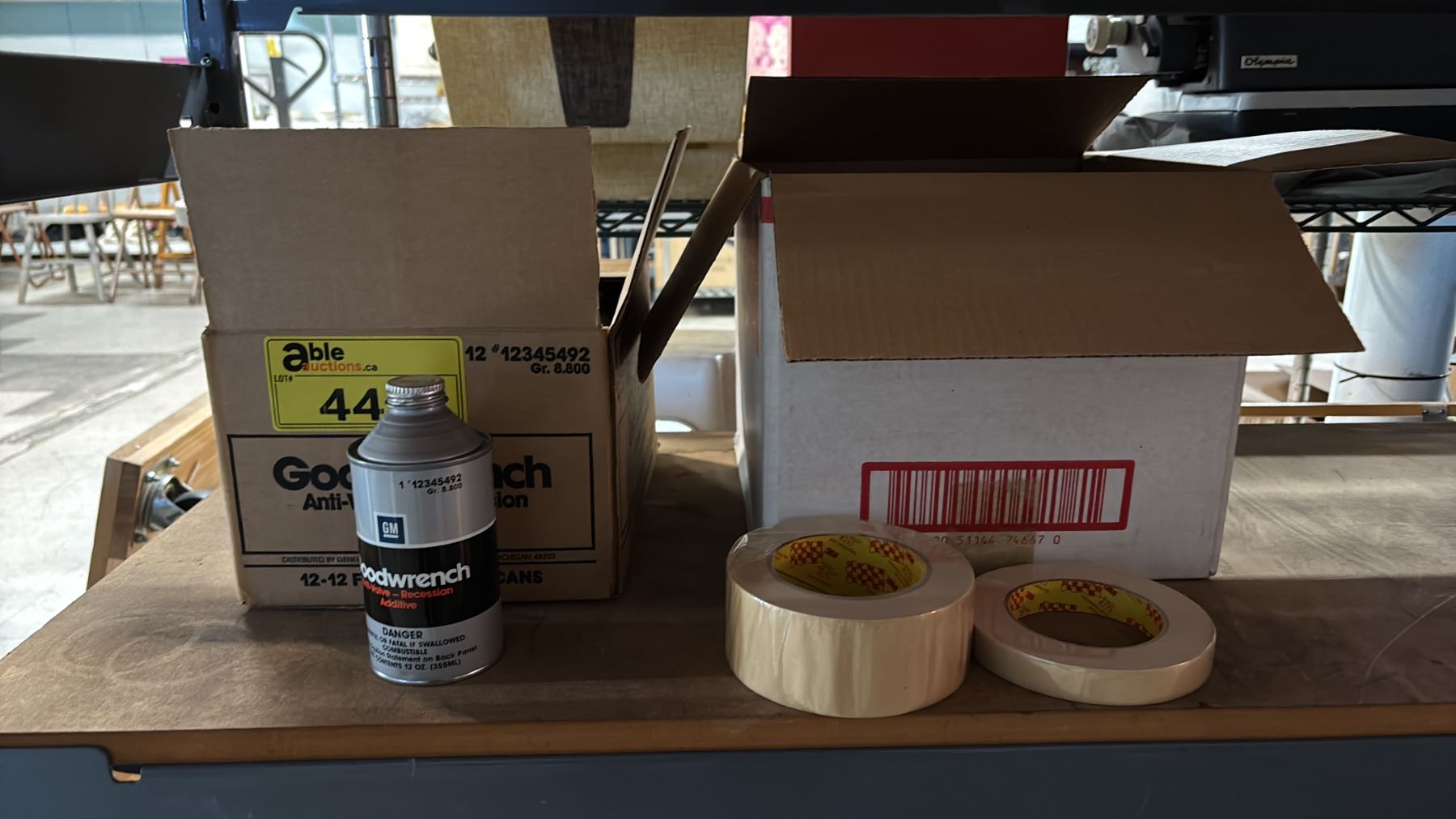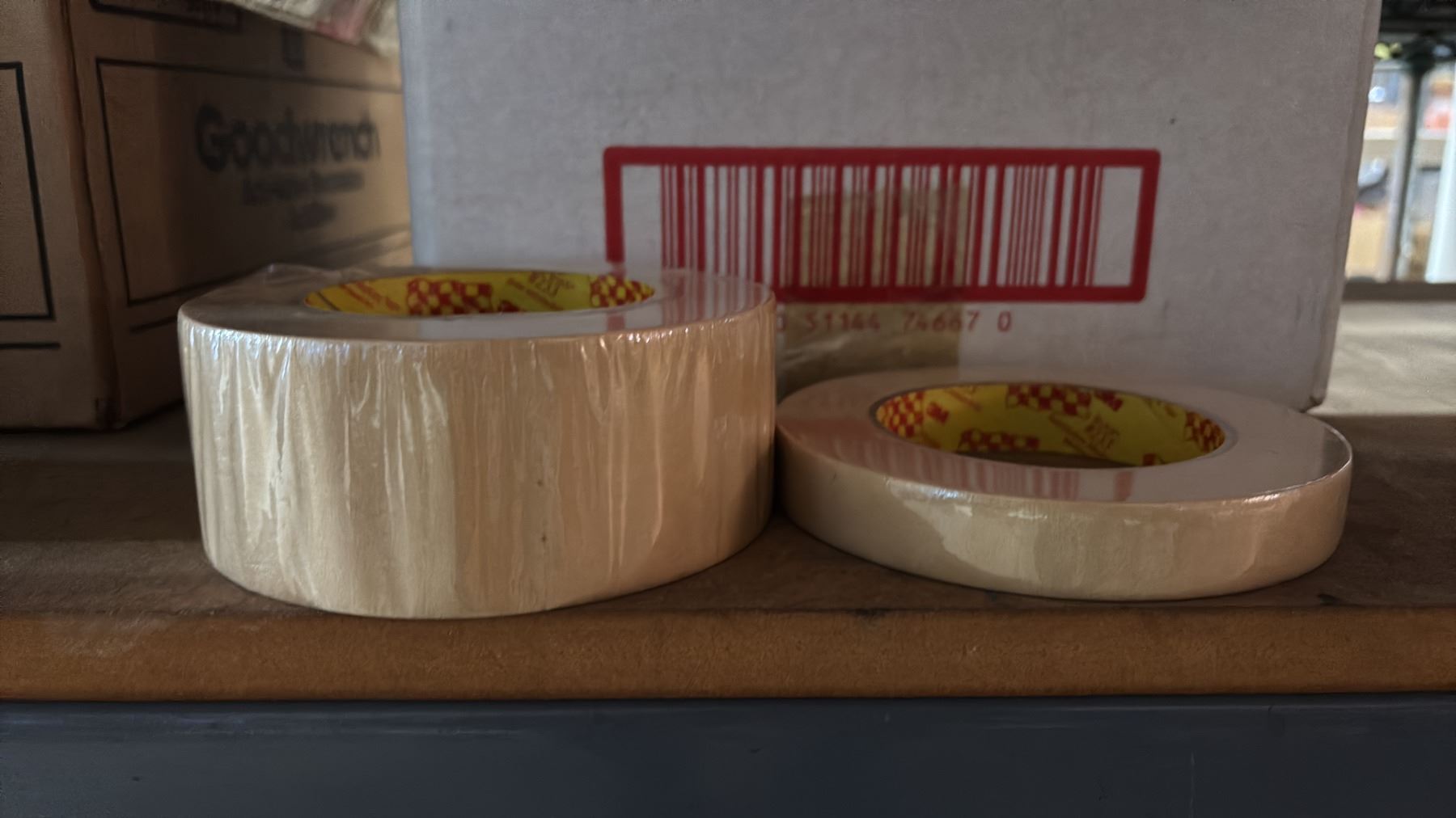 BOX OF GOODWRENCH ANTI-VALVE RECESSION ADDITIVE & BOX OF TAPE ROLLS