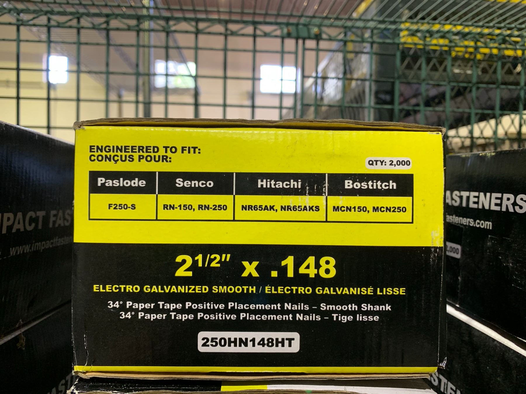 BOX OF IMPACT FASTENERS ELECTRO GALVANIZED, SMOOTH, HEAT TREATED 2-1/2" X .148 34 DEGREE PAPER TAPE POSITIVE PLACEMENT NAILS - SMOOTH SHANK 2000 COUNT