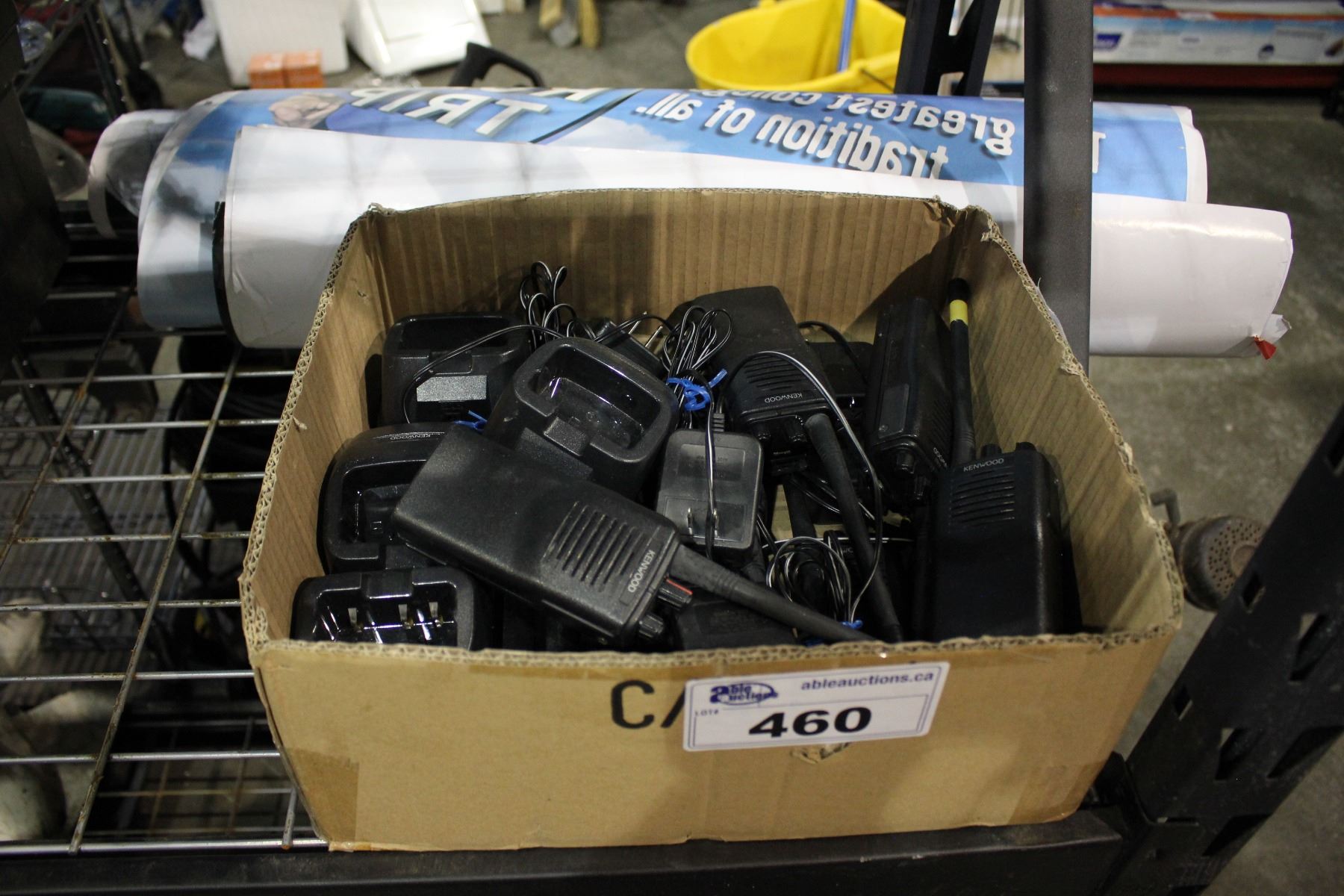 BOX OF KENWOOD WALKIE TALKIES AND ROLL OF ASSORTED POSTERS