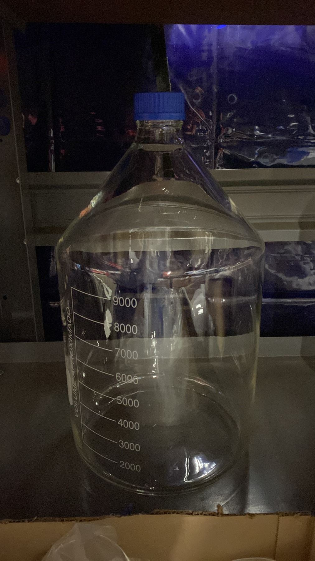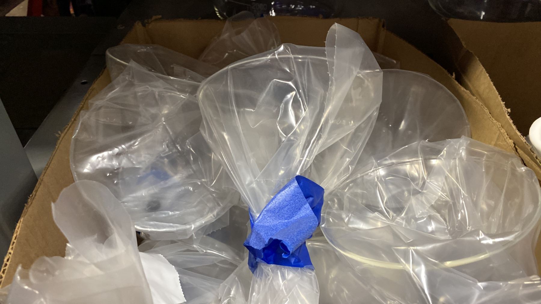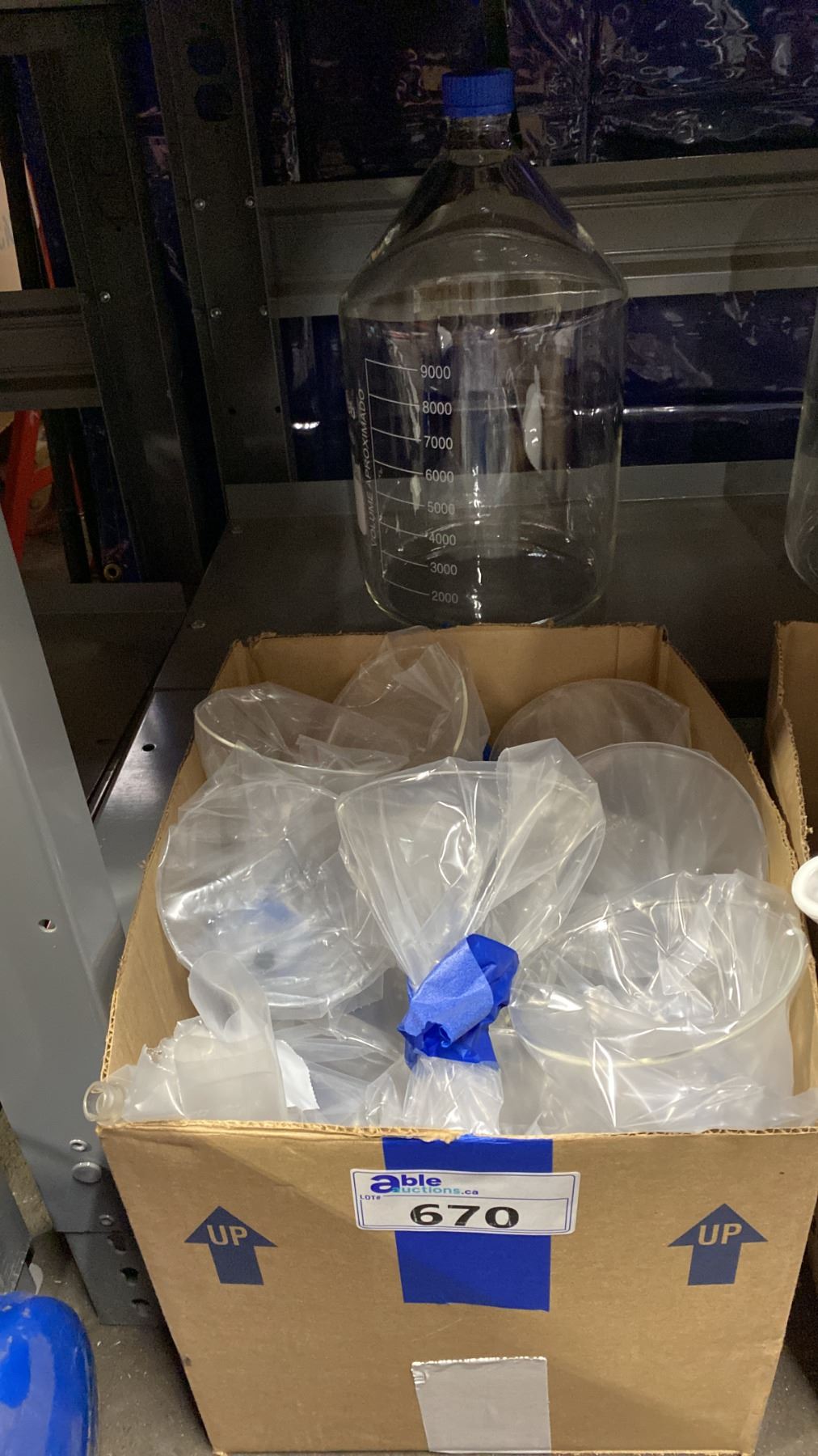 BOX OF LABORATORY GLASS FUNNELS & LARGE GLASS JAR