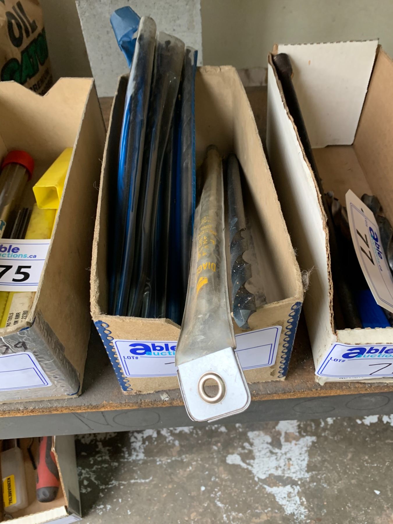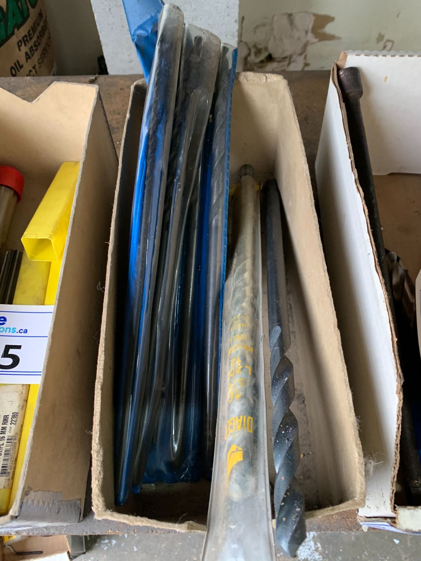 BOX OF MACHINIST TOOLS-ASSORTED LONG DRILL BITS & 1 MASONRY BIT